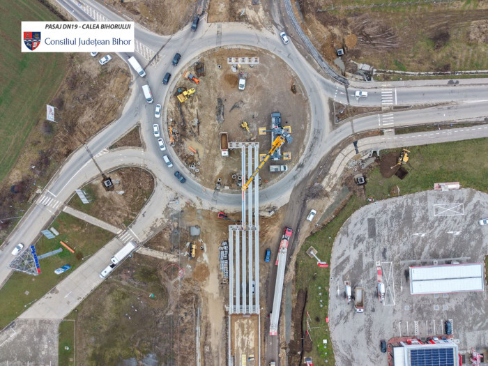 Săptămâna aceasta a început montarea grinzilor la pasajul suprateran care se construiește la ieșirea din Oradea spre Satu Mare, deasupra sensului giratoriu de la intersecția DN19 și Calea Bihorului.