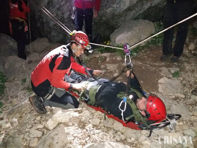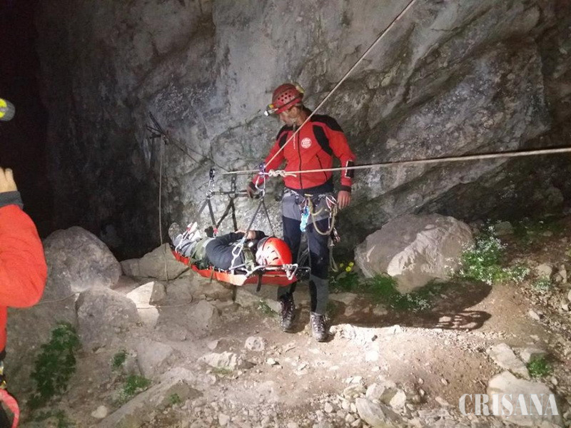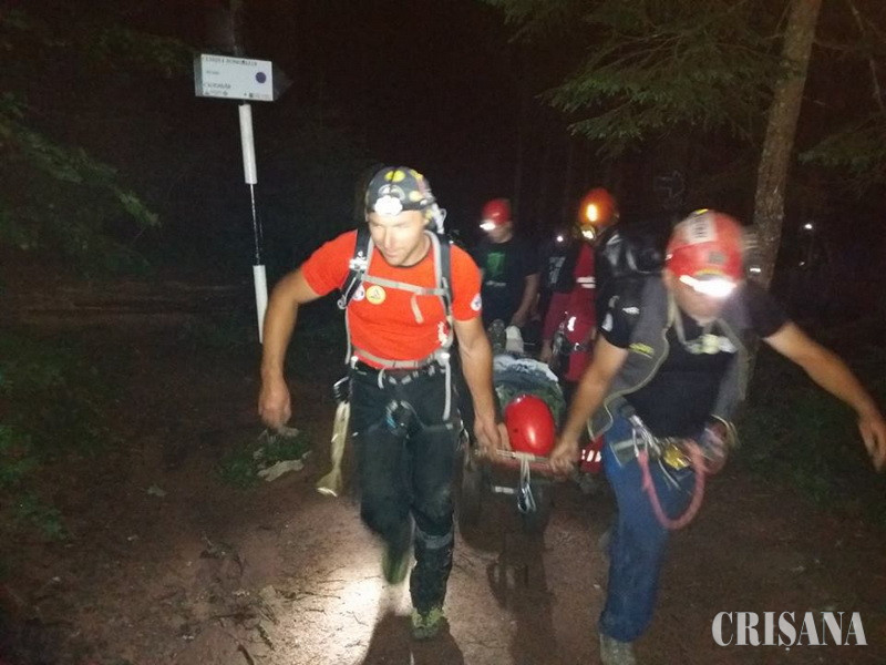 După imobilizarea membrului fracturat, respectiv echiparea traseului de evacuare, victima a fost transportată pe targă și, la cinci ore după declanșarea alarmei, a fost predată echipajului SMURD.