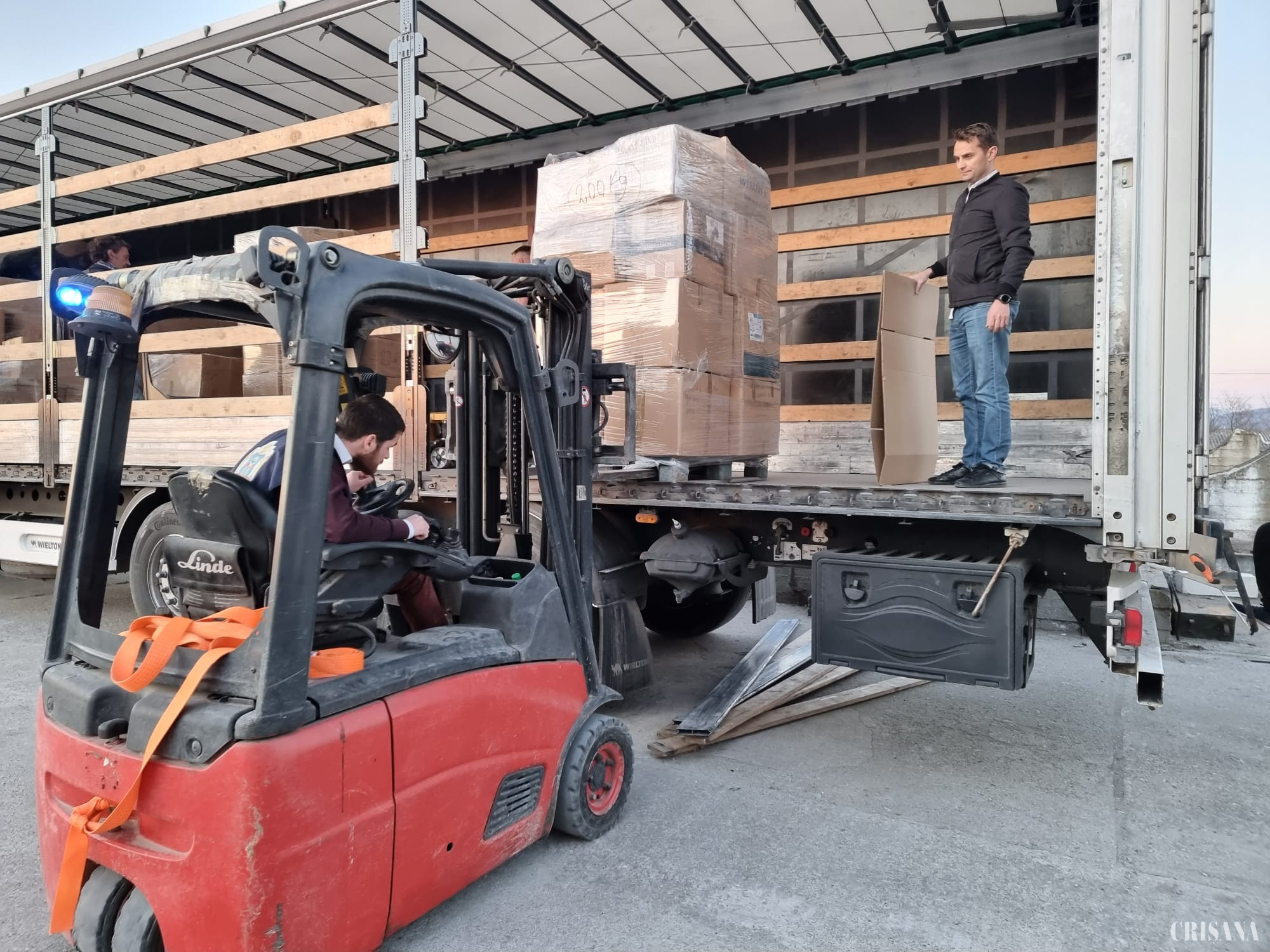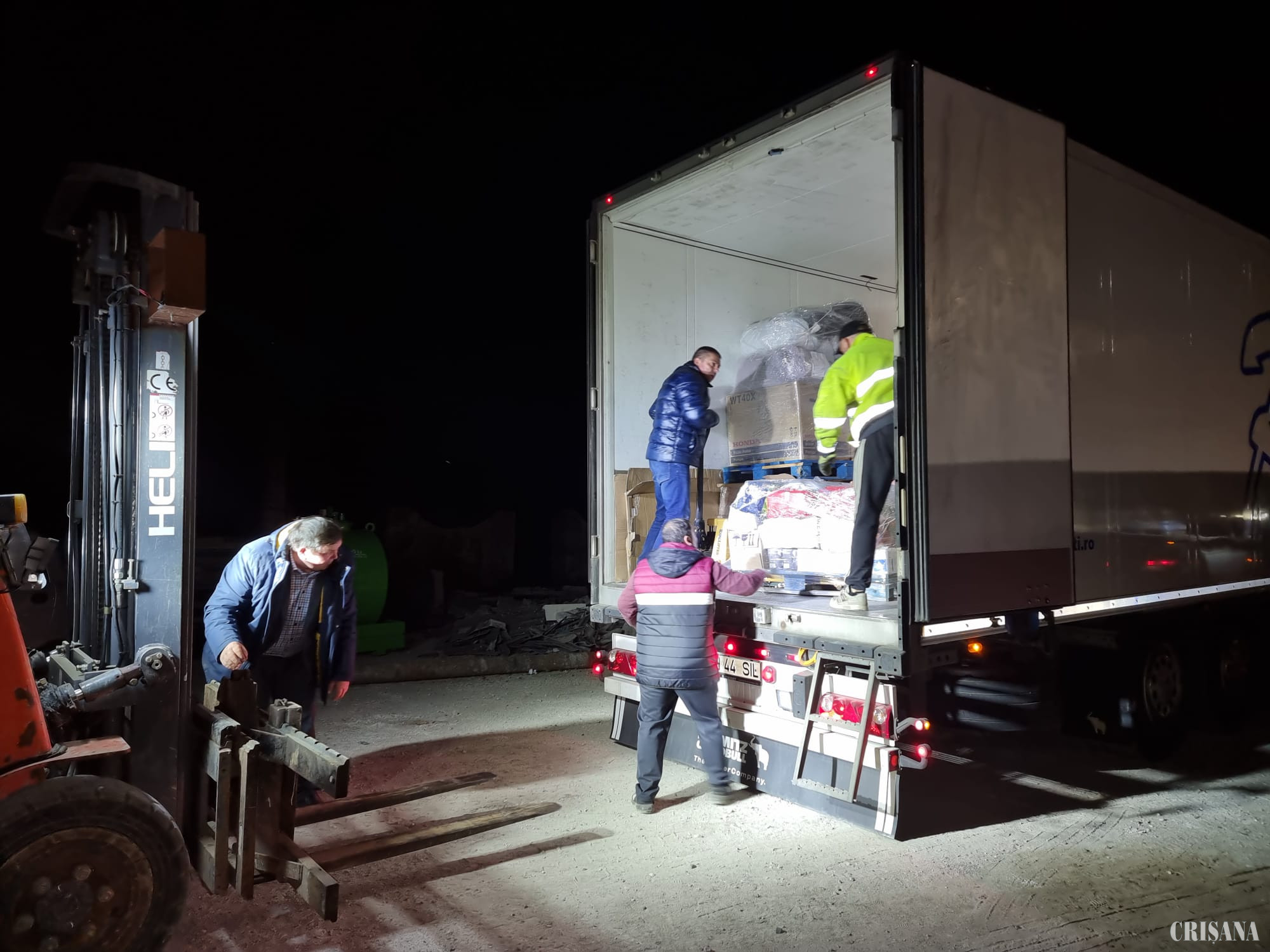 După un drum de trei ore, cele două camioane care au pornit de la Oradea, încărcate cu aproape 20 de tone de ajutoare, au ajuns ieri după-masă în apropiere de vama Halmeu, unde o mână de voluntari au lucrat la foc continuu pentru a descărca paleții și a-i reîncărca în alte două TIR-uri venite din Ucraina. Toată acțiunea s-a terminat la miezul nopții, când camioanele ucrainenilor au trecut fără probleme granița.