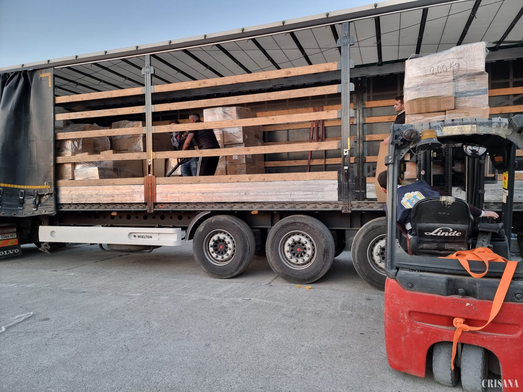 Camioanele de la Oradea au fost încărcate cu alimente neperisabile (conserve, paste făinoase, făină, orez, ulei etc.), articole de îmbrăcăminte sortate pe vârste și categorii, produse de igienă, saltele, saci de dormit și pături.