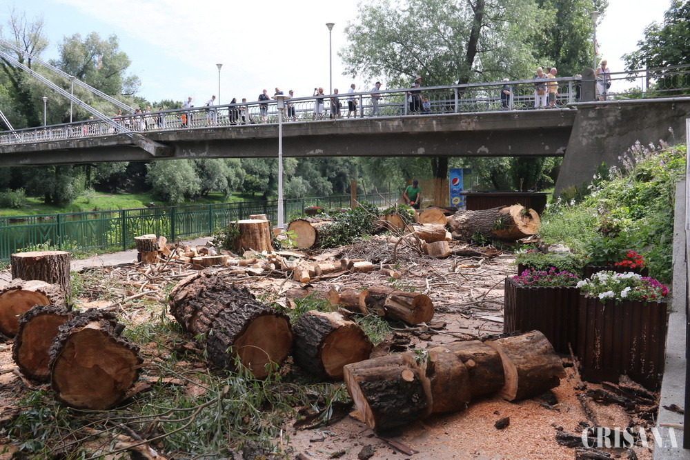 O echipă de muncitori a pus la pământ doi copaci seculari de pe malul Crişului Repede, din imediata vecinătate a pasarelei pietonale cunoscută sub numele de Podul Intelectualilor. Anul trecut cei doi arbori, dintre care unul cu diametrul de aproape un metru, au fost toaletaţi atât de intens încât anul acesta, deşi bogat în precipitaţii, copacii s-au uscat. Drept urmare, ieri au intrat în acţiune drujbele, arborii fiind tăiaţi în buşteni potriviţi pentru foc.