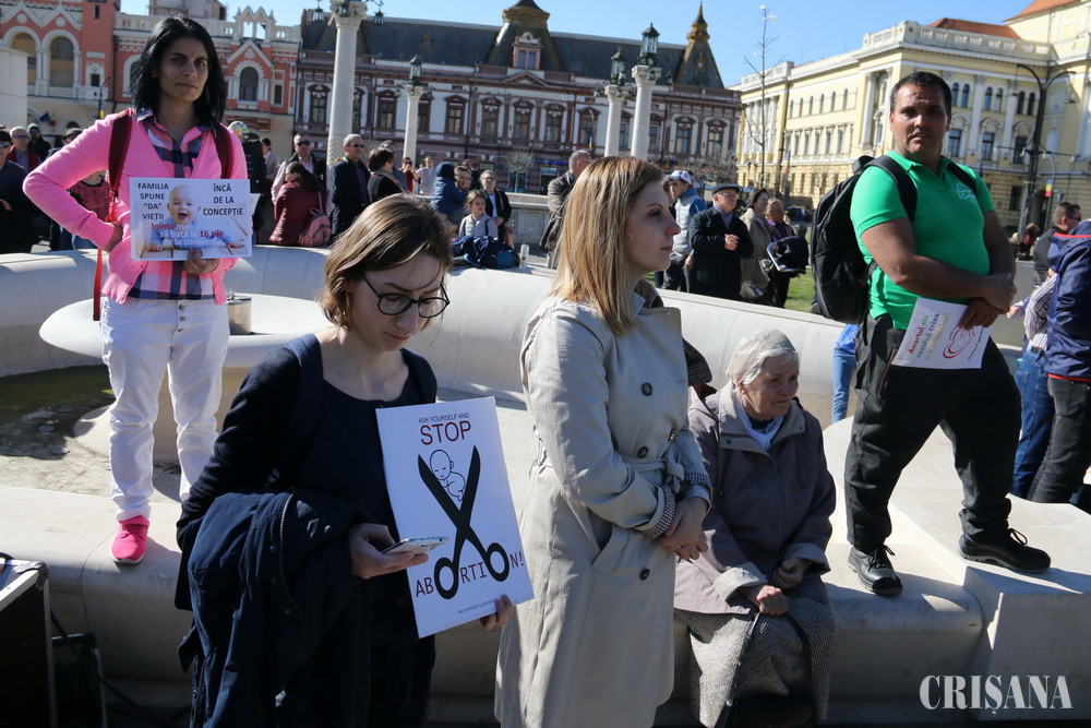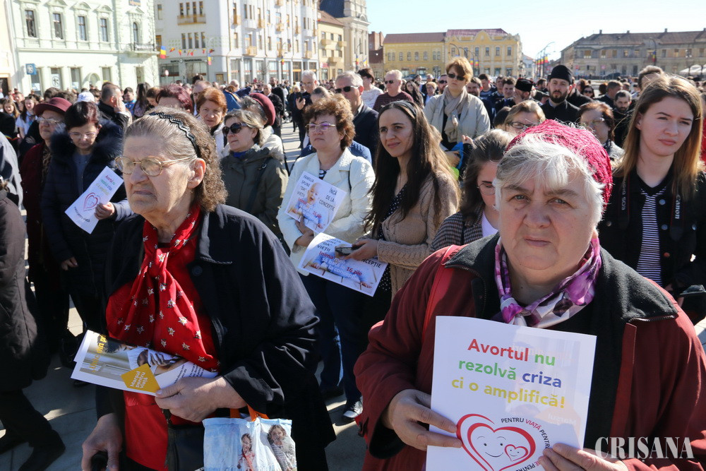 La Oradea, evenimentul a început sâmbătă, la ora 15.00, cu o adunare publică în Piaţa Unirii, la eveniment fiind prezenţi liderii culteor religioase din judeţ, respectiv episcopul ortodox Sofronie Drincec, episcopul romano-catolic László Böcskei, episcopul greco- catolic Virgil Bercea, pastorul Petru Vidu, preşedintele comunităţii baptiste, pastorul Liviu Apolzan, preşedintele comunităţii penticostale şi rectorul Universităţii Emanuel, profesorul Paul Negruţ. În Piaţa Unirii s-au adunat câteva sute de persoane, purtând pancarte şi afişe cu mesaje precum „Un copil avortat este omor calificat", „Familia spune DA vieţii" sau „Cum să meargă ţara bine cu milioane de nepedepsite crime?".