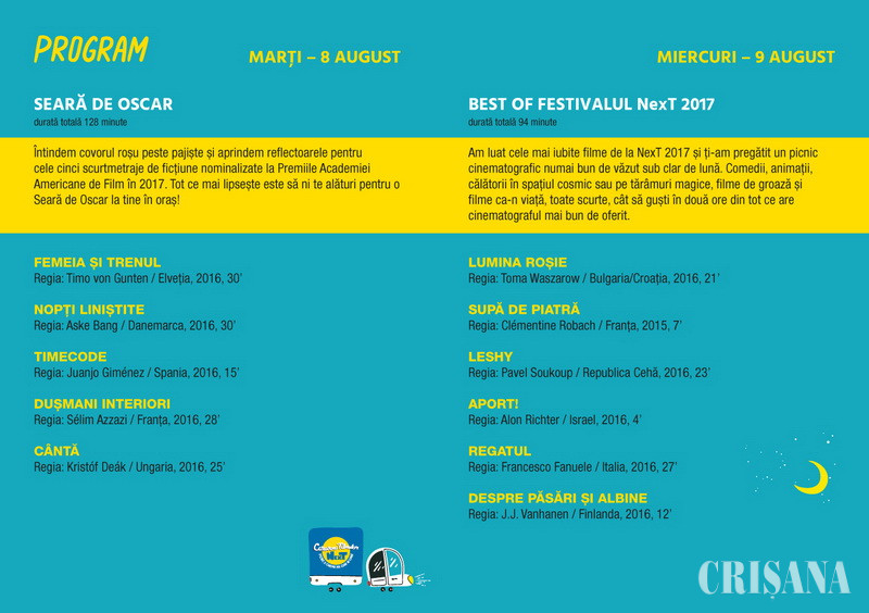 De patru ani organizatorii Festivalului Internaţional de Film NexT vin în întâmpinharea publicului din provincie, prin intermediul caravanei care permite proiectarea celor mai apreciate filme în diverse oraşe din România. Oradea este inclusă în itinerariul caravanei NexT, iar proiecţiile debutează în această seară, de la ora 21.30. Astfel, cei prezenţi în Parcul Cetăţii vor participa la seara de Oscar. Cele cinci scurtmetraje care pot fi vizionate sunt: Femeia și trenul, r: Timo von Gunten, Elveția, 2016, 30’; Nopți liniștite, r: Aske Bang, Danemarca, 2016, 30’; Timecode, r: Juanjo Giménez, Spania, 2016, 15'; Dușmani interiori, r: Sélim Azzazi, Franța, 2016. 28’ şi Cântă, r: Kristóf Deák, Ungaria, 2016, 25’. Mâine, 9 august, orădenii vor vedea Best of Festivalul NexT 2017, o retrospectivă cu cele mai iubite filme de la NexT 2017, comedii, animații, călătorii în spațiul cosmic sau pe tărâmuri magice, filme de groază și filme ca-n viață, toate scurte, cât să guști în două ore din tot ce are cinematograful mai bun de oferit: Lumina roşie, r: Toma Waszarow, Bulgaria/Croația, 2016, 21’; Supă de piatră, r: Clémentine Robach, Franța, 2015, 7’; Leshy, r: Pavel Soukoup, Republica Cehă, 2016, 23’; Aport!, r: Alon Richter, Israel, 2016, 4’; Regatul, r: Francesco Fanuele, Italia, 2016, 27’; Despre păsări și albine, r: J. J. Vanhanen, Finlanda, 2016, 12’. Joi, 10 august, Caravana Filmelor NexT a pregătit o seară dedicată filmelor românești: întâmplări de familie rupte din viață și povești de dragoste cu întorsături neașteptate, spuse pe scurt, cu multă imaginație: Mamă, tată, trebuie sa vă spun ceva, r: Paul Mureșan, 2016, 6’ ; Omul de pe lună, r: Mihnea Aliciu, 2016, 18'; O noapte de dragoste, r: Alexandru Mavrodineanu, 2016, 25’; Pipa, sexul și omleta, r: Ana Maria Comănescu, 2016, 23' (Premiul publicului pentru film românesc la festivalul NexT 2017) şi Plecarea, r: Cătălin Drăghici, 2017, 22'.