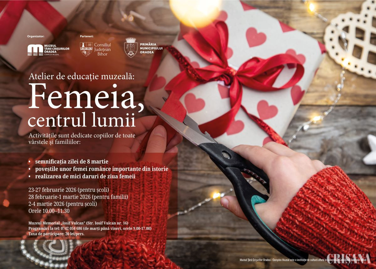 Muzeul Țării Crișurilor Oradea – Complex Muzeal organizează, în parteneriat cu Consiliul Județean Bihor și Primăria Municipiului Oradea, atelierul de educație muzeală „Femeia, centrul lumii”, la Muzeul Memorial „Iosif Vulcan” (str. Iosif Vulcan nr. 16). Acesta se va desfășura în perioadele 23-27 februarie (pentru școli), 28 februarie-1 martie (pentru familii) și 2-4 martie (pentru școli), între orele 10.00–11.30.