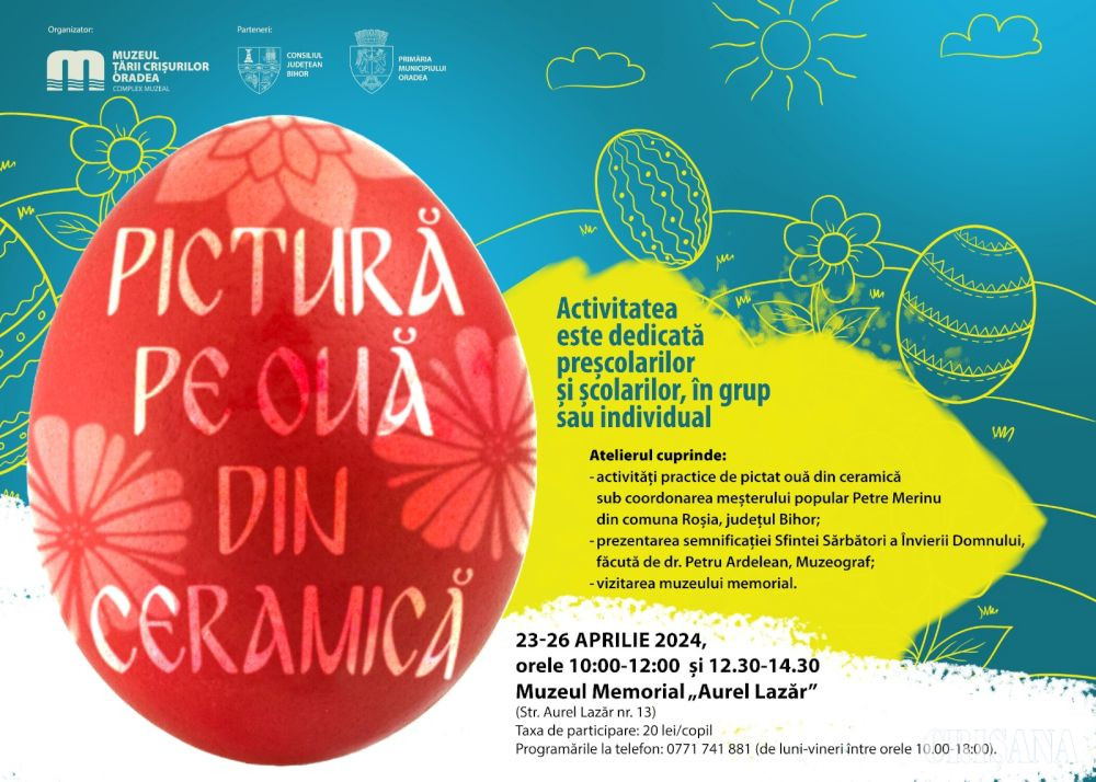 Activitatea este dedicată preșcolarilor și școlarilor, în grup sau individual, și va cuprinde: activități practice de pictat ouă din ceramică, sub coordonarea meșterului popular Petre Merinu din comuna Roșia; prezentarea semnificației Sfintei Sărbători a Învierii Domnului, susținută de dr. Petru Ardelean, muzeograf în cadrul Secției de Istorie a Muzeului Țării Crișurilor Oradea - Complex Muzeal; vizitarea muzeului memorial. Atelierele vor avea loc la Muzeul Memorial „Aurel Lazăr” (Str. Aurel Lazăr nr. 13), în perioada 23-26 aprilie, orele 10.00-12.00 și 12.30-14.30. Activitățile sunt organizate de Cornelia Romînașu, muzeograf în cadrul serviciului Științele Naturii și Muzee Memoriale, Grupuri Sociale, Istorie a Minorităţilor. Programări la telefon 0771.741.881, luni-vineri între orele 10.00-18.00.