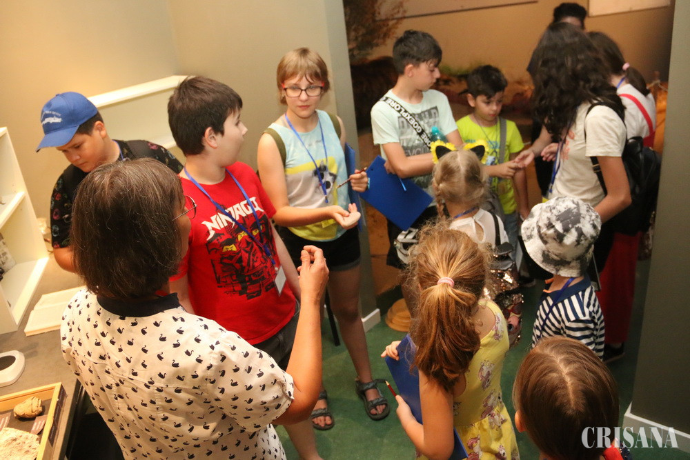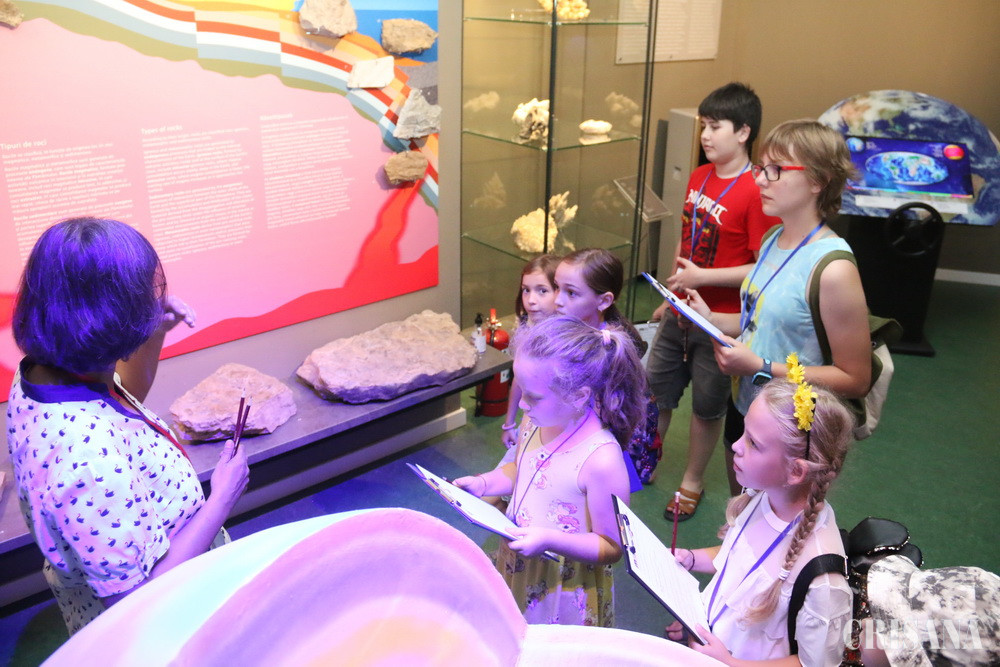 „Mergem sus, în expoziție, traversăm Tunelul Timpului, și ne vom opri în prima sală, unde este și Camera Cercetătorului. Acolo, veți afla ce avem noi în colecție, de la fosile, mod de fosilizare, formarea rocilor, prepararea/conservarea colecțiilor de paleontologie, zoologie etc.”, i-a anunțat muzeograful Erika Posmoșanu pe copii.