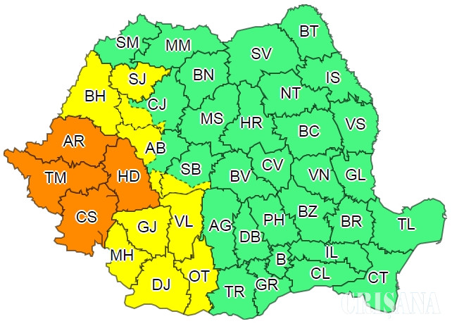 În județele Caraș – Severin, Timiș, Hunedoara și Arad vor fi averse torențiale și grindină. Local cantitățile de apă vor fi de 40-70 l/mp (în intervale scurte de timp, de până la 1 – 3 ore).