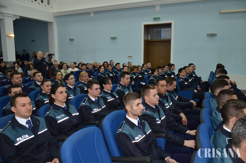 Ceremonia a fost condusă de comisarul şef de poliție Adrian Bucur, desemnat la conducerea Inspectoratului de Poliție Județean Bihor, care a prezentat mesajul Inspectorului General al Poliției Române, chestor principal de poliție Bogdan Despescu, i-a felicitat pentru rezultatele obţinute la examen şi i-a îndemnat să poarte cu mândrie şi responsabilitate uniforma de poliţist. În prezența prefectului județului Bihor, Claudiu Adrian Pop, care i-a felicitat şi le-a urat mult succes în profesia pe care şi-au ales-o, cei 47 de polițiști bihoreni proaspăt încadrați în rândul Poliției Bihorene au rostit la unison: „Jur să respect Constituţia, drepturile şi libertăţile fundamentale ale omului, să aplic în mod corect şi fără părtinire legile ţării, să-mi îndeplinesc cu răspundere şi bună credinţă îndatoririle ce-mi revin potrivit funcţiei şi să păstrez secretul profesional. Aşa să-mi ajute Dumnezeu!”. La festivitate au participat și familiile celor 47 de noi agenți de poliție bihoreni, vădit emoționate de însemnătatea momentului. „Începând cu 16 ianuarie, cei 47 de polițiști s-au prezentat la datorie, urmând a-și desfășura activitatea ca agenți de ordine și siguranță publică în cadrul poliţiilor orăşeneşti şi ca ajutor de şef de post la posturile de poliție rurale din cadrul Inspectoratului de Poliție Județean Bihor. Din 6 februarie, noii polițiști bihoreni vor participa la cursul de inițiere în carieră, un curs de pregătire intensivă, în cadrul căruia vor învăța tainele meseriei de polițist. După finalizarea cursului, se vor afla în responsabilitatea unui coleg cu experiență, care le va arăta, pas cu pas, ce presupune munca de poliție”, a precizat subcomisarul Alina Dinu, purtătorul de cuvânt al IPJ Bihor. Potrivit acesteia, la sfârșitul celor șase luni de probă, aceștia vor susține un examen de definitivare. Odată promovat acest examen, cei 47 de agenți de poliție vor deveni polițiști cu acte în regulă.