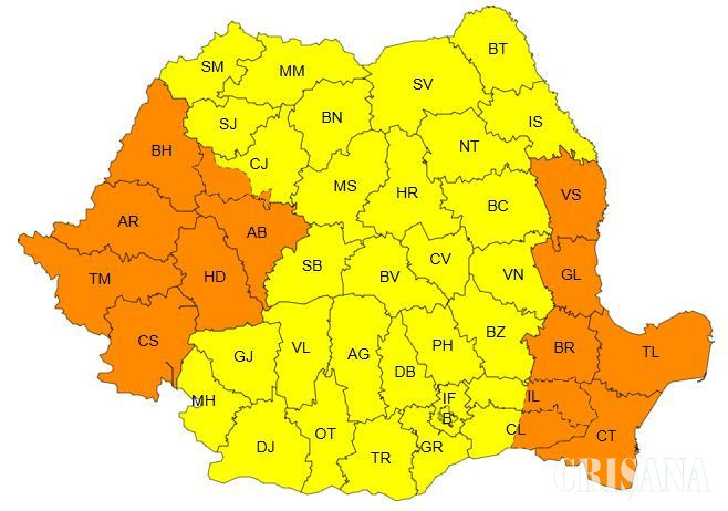 O alertă de tip cod portocaliu, în vigoare joi, între orele 10 – 18, atrage atenția că în județele Constanța, Tulcea, estul județelor Călărași și Ialomița, Brăila, Galați, Vaslui, Caraș-Severin, Timiș, Arad, Bihor, Hunedoara, Alba și zona montană a județului Cluj vor fi intervale cu intensificări puternice ale vântului. În general rafalele vor fi de 70...85 km/h, iar în zona montană înaltă, de peste 120 km/h.