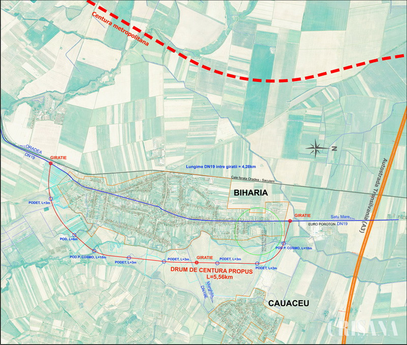 Astfel, centura ocolitoare va reprezenta o alternativă la DN 19 Oradea-Satu Mare, degrevând comuna Biharia de congestionarea traficului în interiorul localității. DN 19 reprezintă și calea de acces către viitorul nod rutier Biharia al autostrăzii Transilvania, ceea ce va genera congestii majore de trafic pe ruta actuală care traversează localitatea Biharia. La aceasta se adaugă şi traficul rezultat de pe relația DN 19E spre DN 19, din directia localiăților Sălard, Chiribiș și Marghita. Lungimea drumului de centură propus este de aproximativ 5,56 km, având punctul de intrare și ieșire a centurii în DN 19 Oradea – Satu Mare. Se va prevedea o platformă de drum de cel puțin 10 m, precum şi amenajarea unei piste de biciclete cu două sensuri de mers, cu lățimea de 3 m, scoasă în afara platformei drumului, de care va fi despărțită de șantul lateral al drumului. Primarul Ilie Bolojan a menţionat că drumul, cu două benzi de circulaţie, este estimat la aproximativ 5 milioane de euro, la care se vor adăuga sumele necesare exproprierii terenurilor. „Estimăm că am putea crește valoarea cu încă 10% pentru a expropria toți proprietarii. Vom căuta o formulă de finanțare din bani europeni în cursul anului următor sau din alte finanțări, de exemplu în parteneriat cu Compania de Drumuri. În cazul în care nici una dintre aceste variante nu va fi fezabilă, am convenit cu doamna primar ca din anul 2020 cel mai târziu, cu susținere din bugetele celor două localități, deci din bugetele locale, să realizăm din surse proprii, după modelul Oradea-Sântandrei, această centură a comunei Biharia, în așa fel încât de la data începerii lucrărilor în maximum un an de zile această lucrare să fie finalizată. Prin urmare, până la sfârșitul acestui an va fi finalizat studiul de fezabilitate. Acest studiu, odată finalizat, îl vom aproba în cele două Consilii Locale, precum și în Comitetul Director al Zonei Metropolitane, unde deja avem o aprobare pentru a demara acest proiect”, a precizat primarul Ilie Bolojan.