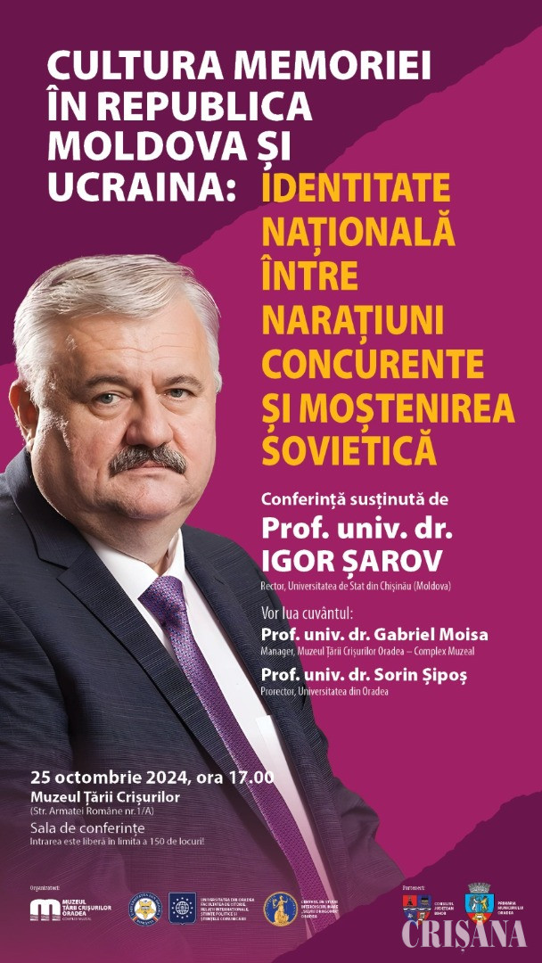 În Sala de conferințe a Muzeului Țării Crișurilor, vineri, 25 octombrie, de la ora 17.00, va avea loc Conferința „Cultura memoriei în Republica Moldova și Ucraina: Identitate națională între narațiuni concurente și moștenirea sovietică”.