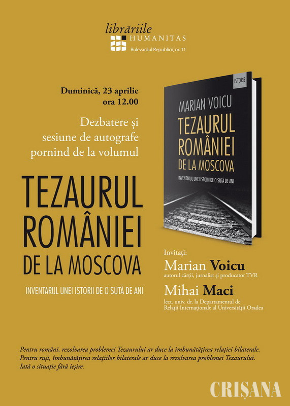 Librăria Humanitas invită orădenii duminică, 23 aprilie, la o dezbatere care va acoperi ultimii o sută de ani din istoria negocierilor pentru restituirea tezaurului românesc trimis în 1916 și 1917 la Moscova pentru protejarea valorilor statului român și rămas în mare parte nerecuperat până azi. Invitaţii dezbaterii sunt jurnalistul Marian Voicu şi lectorul universitar Mihai Maci.
