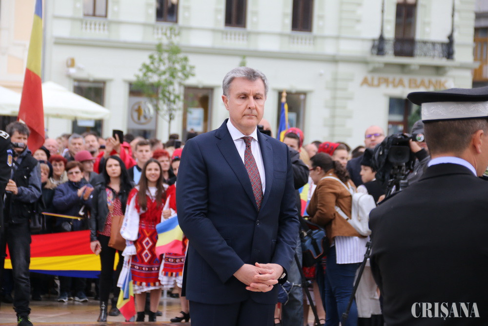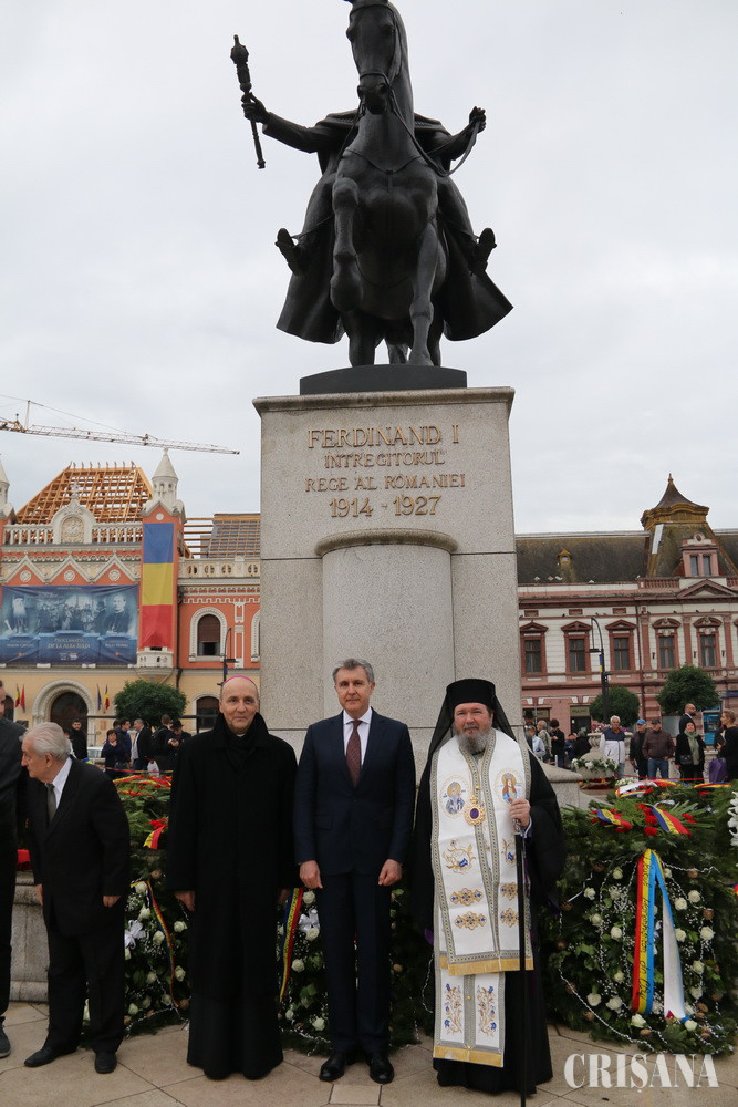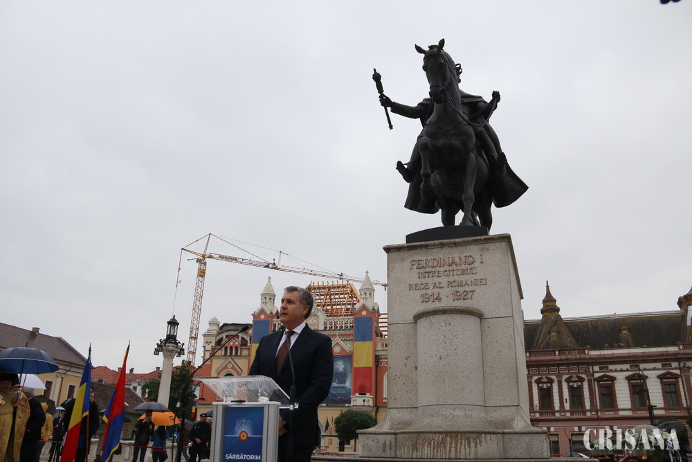 Dezvelirea oficială a statuii Regelui Ferdinand, amplasată în Piaţa Unirii, pe soclul pe care până de curând trona Mihai Viteazul, a avut loc ieri, la ora 17.00. Ploaia nu i-a împiedicat pe orădeni să participe la eveniment, astfel că acesştia au venit în număr destul de mare. O parte dintre cei prezenţi erau elevi, reprezentanţi ai administraţiei locale şi ai instituţiilor din subordine, câteva instituţii deconcentrate, membri PNL şi Pro România, membri ai cluburilor regaliste din Oradea, Pecica şi Cluj, universitari, parlamentari, dar şi foarte mulţi cetăţeni obişnuiţi. De asemenea, a fost prezent, din partea Casei Regale, Principele Radu al României, oaspete al festivităţilor organizate de Primăria Oradea pentru a marca împlinirea celor 100 de ani de la vizita Regelui Ferdinand şi a Reginei Maria în oraşul de pe Crişul Repede, pe data de 23 mai 1919. Au mai fost prezenţi episcopul ortodox al Oradiei, PS Sofronie Drincec, dar şi episcopul greco-catolic de Oradea, PS Virgil Bercea, la prima apariţie publică de mai multe luni. În schimb, au absentat militarii care, tradiţional, fac parte din detaşamentul de onoare, obligatoriu la orice ceremonial de acest gen. Nu au fost prezenţi nici reprezentanţii Prefecturii Bihor şi ai Consiliului Judeţean. Cu o oră înaintea festivităţilor, viceprimarul Florin Birta anunţa, pe Facebook, că armatei „i se interzice să participe la manifestări prin care ne onorăm înaintașii și chiar pe cel care a fost comandant suprem al armatei române întregitoare: regele Ferdinand al României”. „Primăria a decis din timp, cu acordul celor implicați, să organizeze manifestări demne pentru un eveniment care este o filă din istoria neamului. După decizii luate și reevaluate, armata are interzis să participe la manifestări”, a adăugat Birta, care a menţionat că e convins că decizia „este una politică, mizerabilă și delirantă, doar pentru că Oradea are un primar liberal”. „Repet, despre eveniment se știa de două luni, au fost decizii care în ultimele 24 de ore s-au schimbat de trei ori... asta spune tot!!! Cinste veșnică Armatei României și Rușine veșnică ipocriților care sper să fie sancționați și pentru acest gest dezonorant de a împiedica să ne cinstim demnitatea de români”, a afirmat, la final, viceprimarul.