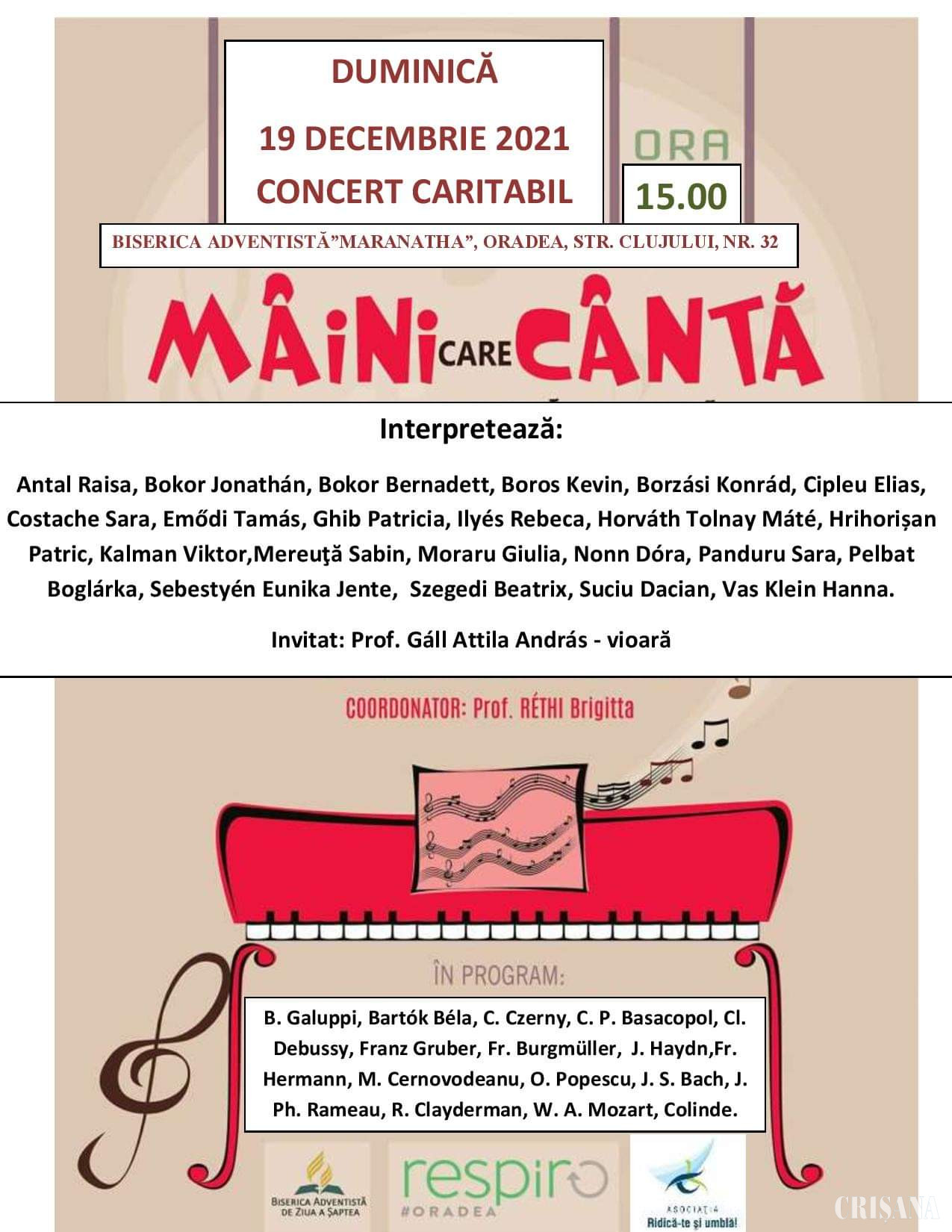 La Biserica Adventistă de Ziua a Șaptea Maranatha din Oradea, situată pe Calea Clujului, nr. 32, Asociația „Ridică-te și umblă!”, în colaborare cu Asociația Profactum și Centrul Respiro, organizează Concertul caritabil „Mâini care Cântă”.