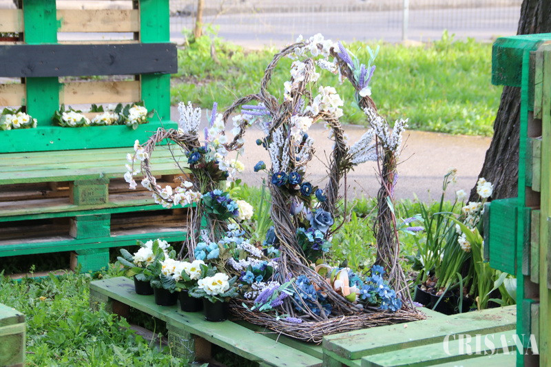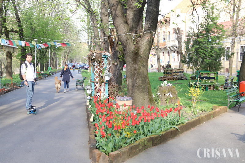 Explozia de culoare din Parcul Libertăţii este completată acum de o nouă privelişte, un spaţiu de relaxare făcut din europaleţi coloraţi şi decoraţi cu flori şi verdeaţă. „Cu acordul reprezentanţilor Primăriei, cei 100 de europaleţi amplasaţi, sub formă de cruci, în Piaţa Unirii, pe perioada Târgului de Paşte, au fost aduşi aici, având acum rol de băncuţe. Ne-ar fi părut rău să ajungă în alte locuri nedorite, prin urmare, pe timp de vară, îi vom ţine aici. Procedând astfel, dorim să inducem ideea că orice lucru poate fi refolosit în alt scop”, ne-a declarat proprietarul florăriei Marius Sabău. În aceste zile, Parcul Libertăţii a prins viaţă din nou, după ce bobocii florilor au fost foarte afectaţi de îngheţul şi zăpada din luna martie. „Au înflorit lalelele roşii şi în această săptămână vor înflori şi cele roz şi portocalii”, ne-a mai declarat cel care pune atâta suflet în acest „colţ de rai” al Oradiei.
