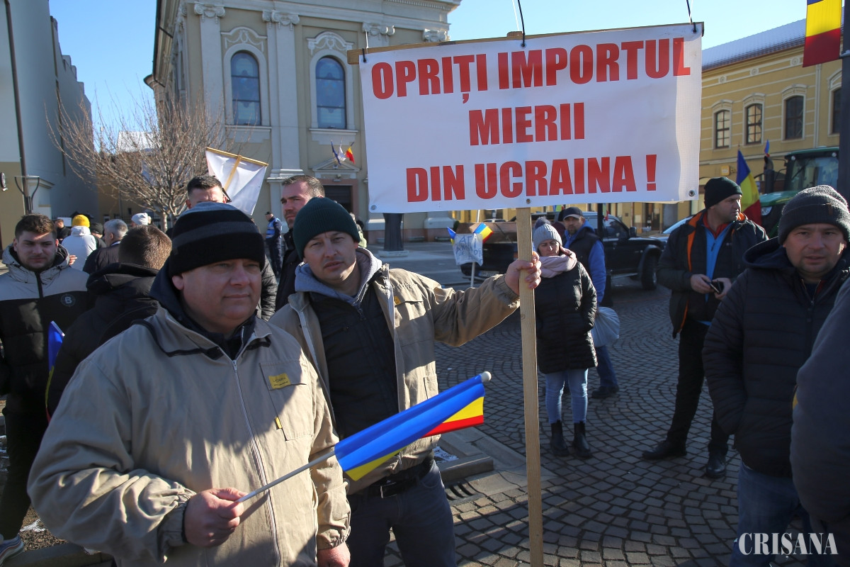 În Piaţa Unirii s-au adunat câteva zeci de fermieri și transportatori bihoreni, unul dintre ei având în bena mașinii un sicriu şi bannere cu mesajele „Ați îngropat agricultura” și „Suntem sclavi în propria țară”. Protestatarii au adus cu ei şi câteva steaguri tricolore dar şi alte bannere cu mesaje precum „Stop importurilor din Ucraina!”
