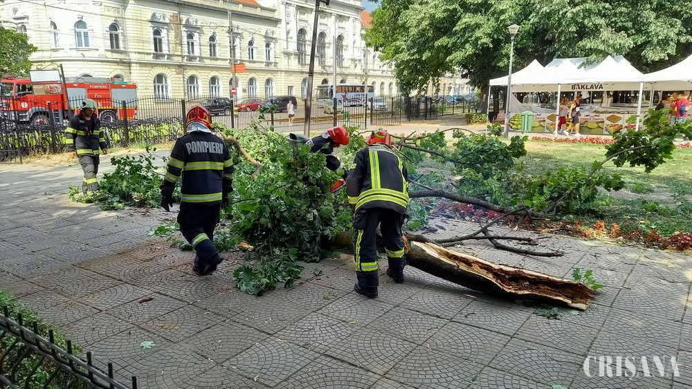 Din păcate, pe la 16.30, s-a stârnit un vânt puternic care a aruncat frunze în toate părțile luând aproape oamenii de pe picioare. După ce s-a mai liniștit, pe partea opusă zonei târgului, spre ieșirea din parc, o creangă cât un copac s-a rupt și a căzut cu zgomot pe dalele de ciment. 3 persoane care erau lângă copac au scăpat ca prin minune. Oamenii au venit repede la fața locului să vadă dacă au pățit ceva. Unul dintre tineri avea bicicleta legată de banca de lângă copac. Ca norocul, creanga căzuse la 2 metri de bancă. Nici nu au trecut 10 minute că la fața locului a sosit o echipă de pompieri de la ISU Crișana, cu drujbe și echipament de protecție și s-a pus la treabă, degajând drumul. Au tăiat crengile și le-au pus la capătul aleii, în zona cu iarbă, locul rămânând mai curat ca înainte.