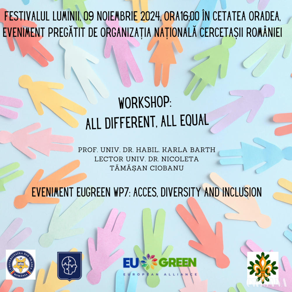 De asemenea, la solicitarea tinerilor organizatori, Universitatea din Oradea va susține două workshop-uri: „All Different, All Equal” și „A Day Without Paper Waste”. Primul este parte a activităților grupului de lucru (WP) „Acces, Diversitate și Incluziune” al EU GREEN și își propune să promoveze diversitatea. Workshop-ul este susținut de prof.univ. dr. habil Karla Barth și lect. univ. dr. Nicoleta Tămășan Ciobanu. „Scopul nostru este acela de a dezvolta abilități și de a încuraja discuții constructive, având în vedere contribuția fiecăruia la o societate mai echitabilă. Atelierul se va concentra pe promovarea accesului egal și a diversității, fiind deschis publicului larg”, a precizat Karla Barth, coordonatoarea grupului de lucru „Acces, diversitate și Incluziune” la nivelul Universității din Oradea.