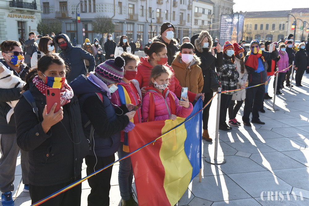 Marţi, 1 Decembrie, aproximativ 300 de orădeni au fost prezenţi la festivităţile organizate în Piaţa Unirii de Prefectura judeţului Bihor. Din pricina pandemiei, anul acesta au lipsit din program festivităţile şi discursurile. De asemenea, s-a renunţat la tradiţionala fasole cu ciolan.