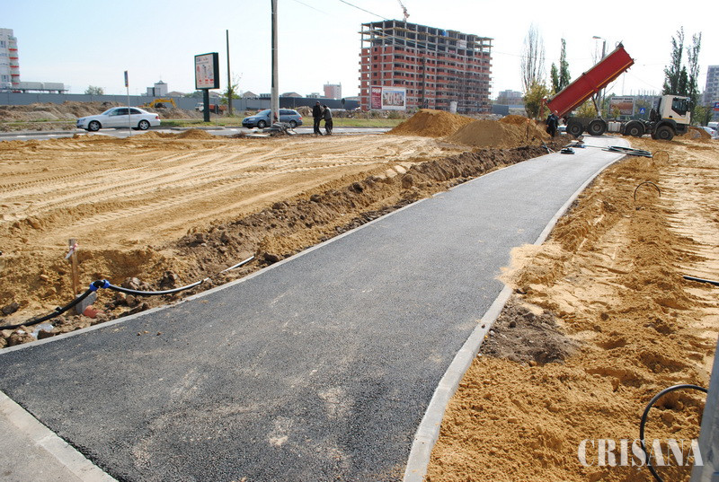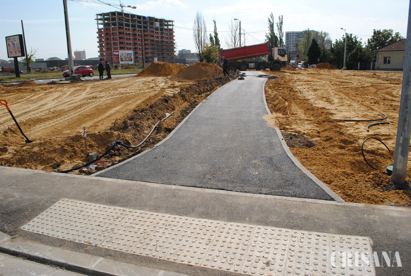 În prezent, terenul a fost decapat la 15 cm sub nivelul drumului, urmând să fie adus pământ fertil, după care se va monta instalația de irigare și se va trece la însămânțarea terenului și plantarea de arbori și arbuști. Și aici lucrările vor fi gata în cursul lunii noiembrie.
