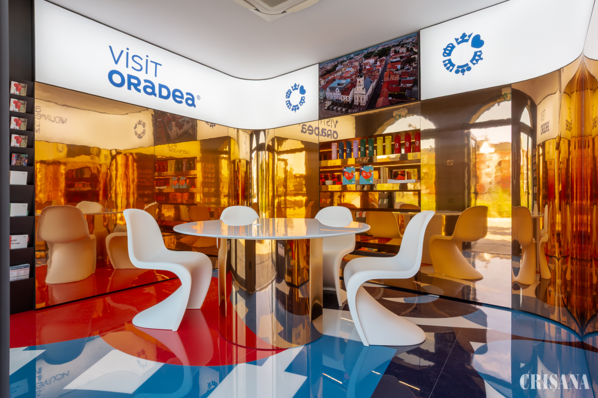 Acest proiect nu își propune să fie doar un simplu punct de informare, ci și o experiență vizuală și senzorială unică, inspirată din arhitectura orașului și transpusă într-un limbaj contemporan, aflat la granița dintre instalație artistică și spațiu funcțional. Designul interior este unul cel puțin spectaculos. Pereții sunt placați cu cupru și reușesc să transforme lumina și peisajul urban într-un dialog permanent cu exteriorul, iar pardoseala colorată în nuanțele identitare ale brandului Visit Oradea aduce energie și dinamism. Mobilierul alb, cu forme fluide, completează atmosfera, oferind repaus vizual într-un cadru vibrant și modern.