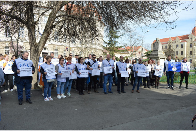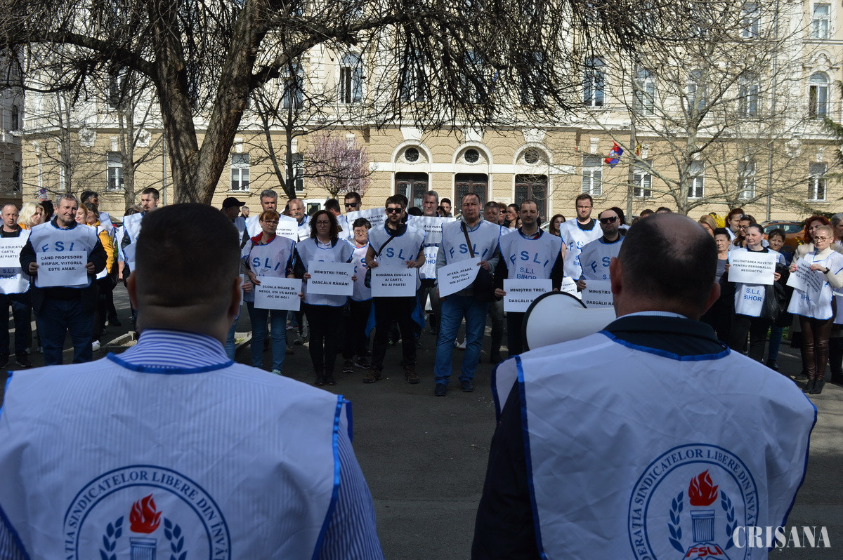 În jur de 100 de cadre didactice, nedidactice și didactice auxiliare, au protestat azi, 23 martie, în fața Prefecturii Bihor, nemulțumite de lipsa sporurilor, de locul pe care salariul lor îl ocupă în grila de salarizare, de munca gratuită prestată la olimpiade și concursuri și de salariile mici ale debutanților.
