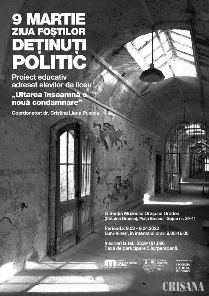 Muzeul Țării Crișurilor Oradea - Complex Muzeal, în colaborare cu Asociația Cei 40 de Mucenici, va derula, în luna martie, proiectul „Uitarea înseamnă o nouă condamnare”, care se adresează elevilor de liceu interesați de represiunea comunistă și memorialistica detenției.