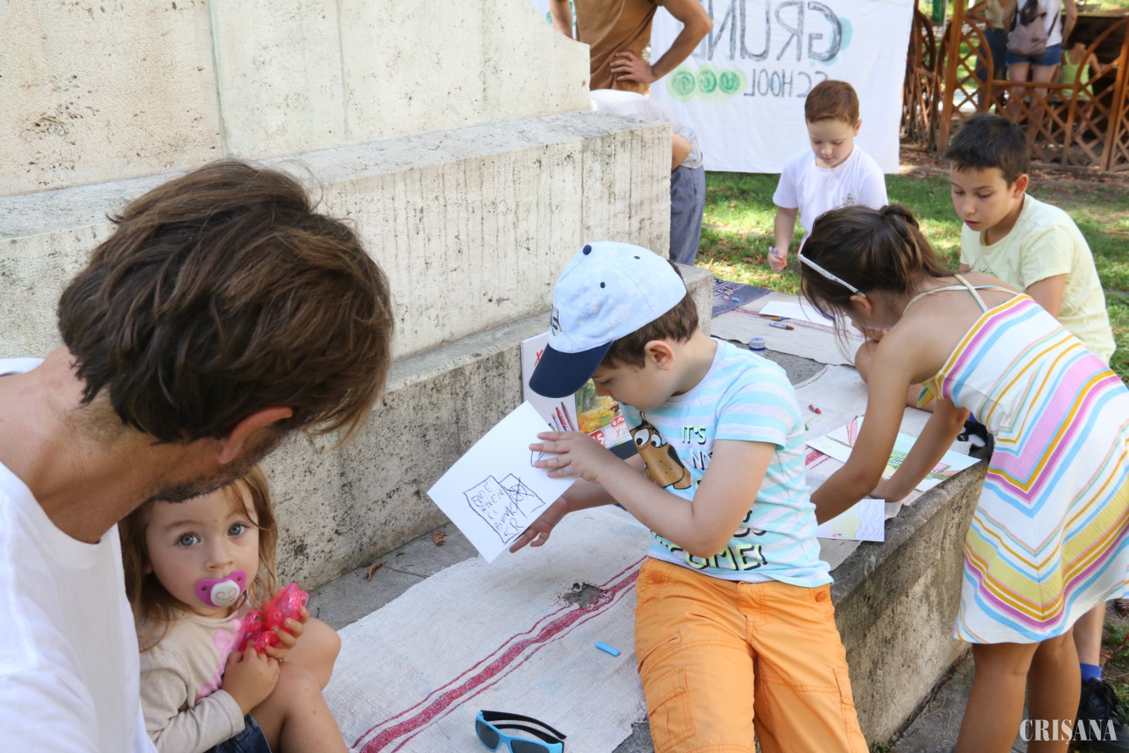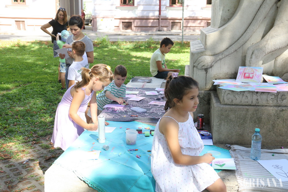 Atmosferă frumoasă sâmbătă în Parcul Libertății. În jur de 15 copilași, mai măricei sau cu suzete, se adunaseră în jurul statuii lui Szacsvay Imre pentru a desena. Atelierul a fost susținut de instructori din cadrul Asociației Grund Community materialele necesare fiind oferite gratuit fiecărui participant.