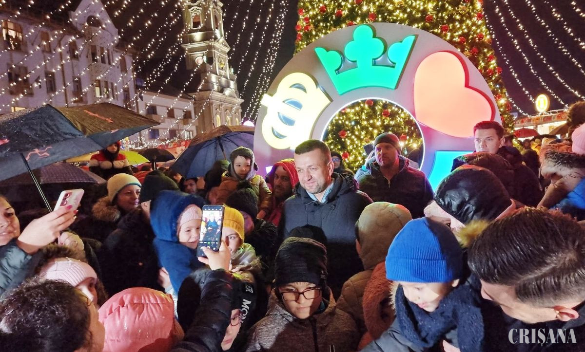 Sute de orădeni s-au adunat joi seara în Piața Unirii din Oradea, chiar dacă a plouat, pentru a asista la momentul aprinderii iluminatului de sărbători și la deschiderea Târgului de Crăciun.