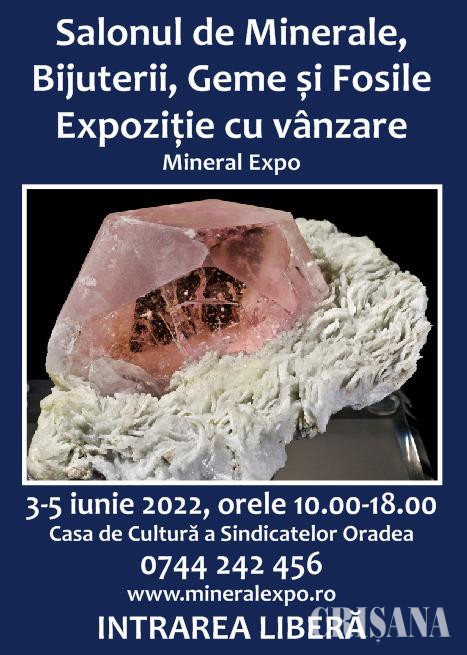 „Mineral Expo (expoziții de bijuterii şi minerale) este un proiect ambiţios născut din pasiunea pentru frumos. După limitările referitoare la organizarea de evenimente din perioada pandemică, seria expozițiilor itinerante continuă cu Salonul de Minerale, Bijuterii, Geme şi Fosile din Oradea, eveniment găzduit de Casa de Cultură a Sindicatelor, între 3 şi 5 iunie 2022”, anunță organizatorii evenimentului.