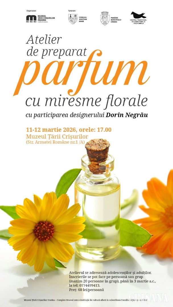 Muzeul Țării Crișurilor Oradea – Complex Muzeal, în parteneriat cu Centrul Tradițional de Conectare la Viața Simplă, organizează atelierul de preparat parfum cu miresme florale, adresat adolescenților și adulților, care va avea loc la sediul Muzeului Țării Crișurilor în 11 și 12 martie, de la ora 17.00.