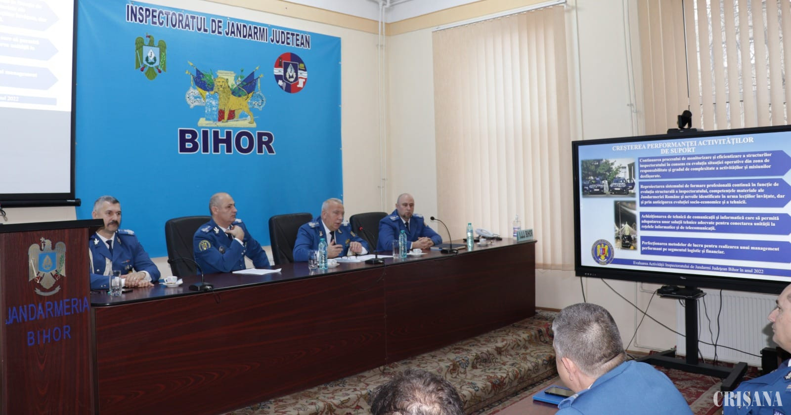Evaluarea activității Inspectoratului de Jandarmi Județean Bihor în anul 2022 a avut loc, joi, la sediul instituţiei, eveniment la care a participat reprezentantul Inspectoratului General al Jandarmeriei Române, colonel Traian Mârza - șeful Direcției Cabinet. Inspectorul șef al Jandarmeriei Bihor, colonel Ioan Bogdan a prezentat activitățile organizate, misiunile executate și rezultatele obținute în anul precedent, conturând, totodată, și principalele direcții de acțiune pentru anul în curs. Astfel, potrivit bilanţului, activitatea desfășurată în anul 2022 a avut ca obiectiv prioritar îndeplinirea principalelor misiuni ale instituției: asigurarea ordinii și siguranței publice, participarea în sistem integrat cu poliția, la menținerea acesteia, asigurarea pazei și protecției instituționale la obiectivele din competență și a transporturilor speciale, de bunuri și valori și corespondenţă clasificată. Structurile de ordine publică au executat 6.222 de misiuni specifice, 513 fiind misiuni de asigurare a ordinii publice. Dintre acestea, 29 de misiuni au fost pe timpul manifestărilor de protest; 301 pe timpul manifestărilor cultural-artistice, religioase, comemorative; 136 la manifestări sportive; 27 pe timpul desfășurării examenului de Bacalaureat/Evaluare Națională; 15 misiuni specifice combaterii efectelor SARS-CoV-2; 5 misiuni desfășurate pe timpul unor vizite oficiale. Tot în 2022, jandarmii au executat 34 de acțiuni de intervenție la diverse solicitări ale cetățenilor, ponderea cea mai mare fiind constituită de intervenția la solicitări telefonice și prin 112. Alte 5.227 misiuni de menținere a ordinii publice au fost desfășurate în zonele montane, în zona de proximitate a instituțiilor de învățământ, în zone aglomerate precum târguri, oboare, piețe, dar și misiuni de patrulare executate independent sau în sistem integrat cu în mediul urban cât și în mediul rural. De asemenea, 24 de acțiuni speciale au fost desfășurate în cooperare cu Brigada de Combatere a Criminalității Organizate Oradea, precum și cu Parchetele competente pentru efectuarea unor acte procedurale. Bilanţul mai arată că 79 de misiuni au fost efectuate pentru punerea în aplicare a mandatelor de aducere pentru care s-a parcurs distanța de 16.397 km; 345 de acțiuni executate în cooperare/colaborare cu alte instituții. Îndeplinirea acestor misiuni a putut fi realizată prin implicarea unui efectiv de 19.429 de jandarmi. În perioada de referință au fost constatate independent 65 de fapte de natură penală, cu 73 de autori, iar în cooperare cu lucrători din cadrul Inspectoratului de Poliție Județean Bihor au fost constatate 238 de fapte de natură penală cu un număr 254 de autori. De asemenea, au fost constatate 1.657 fapte contravenţionale, fiind aplicate 388 avertismente scrise și 1.269 amenzi în valoare de peste 705.000 lei. În ceea ce privește misiunea de pază și protecție a obiectivelor, bunurilor și valorilor, la nivelul județului Bihor se execută misiuni de pază și protecție instituțională la un număr de 30 obiective. Structurile de pază și protecție instituțională au asigurat paza și protecția fizică a 705 transporturi, încasările provenite din aceste activități, în perioada analizată, fiind în sumă de 66.146.499 lei.