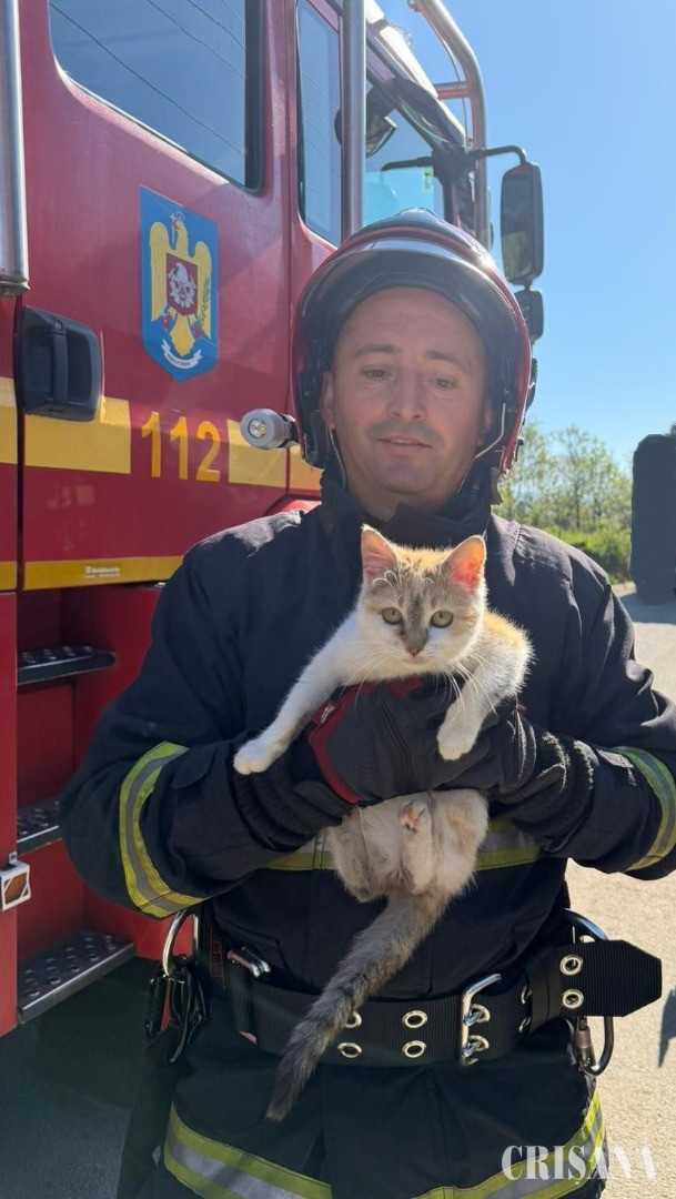 Deși flămândă și extrem de speriată, pisica a fost adusă la sol nevătămată. Intervenția s-a încheiat cu succes, fără incidente.