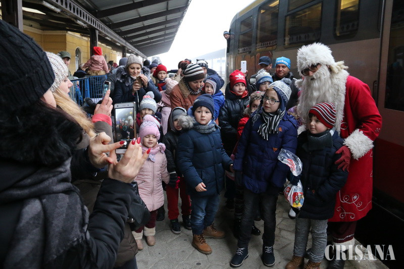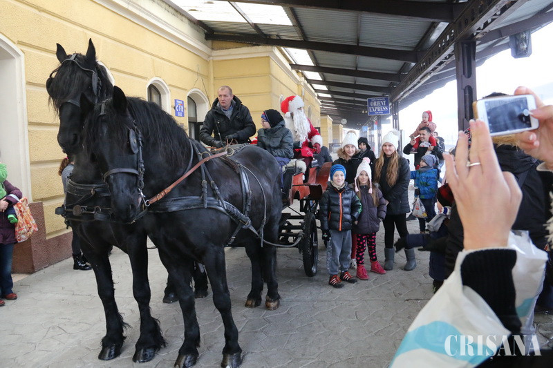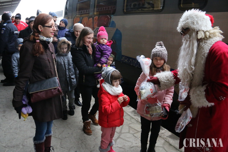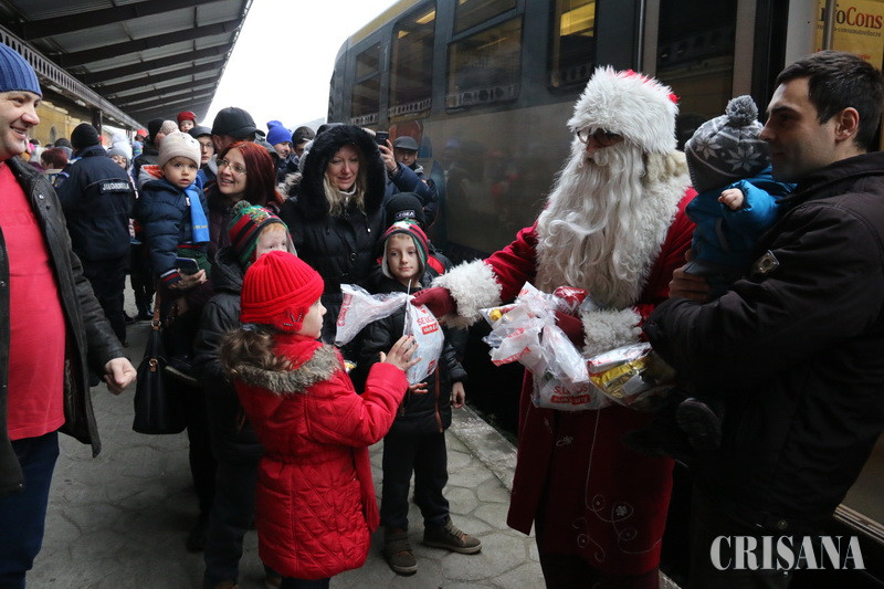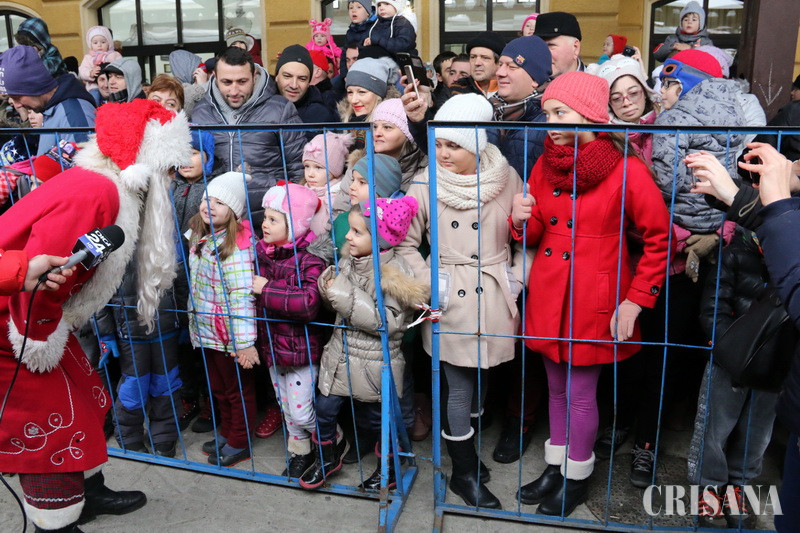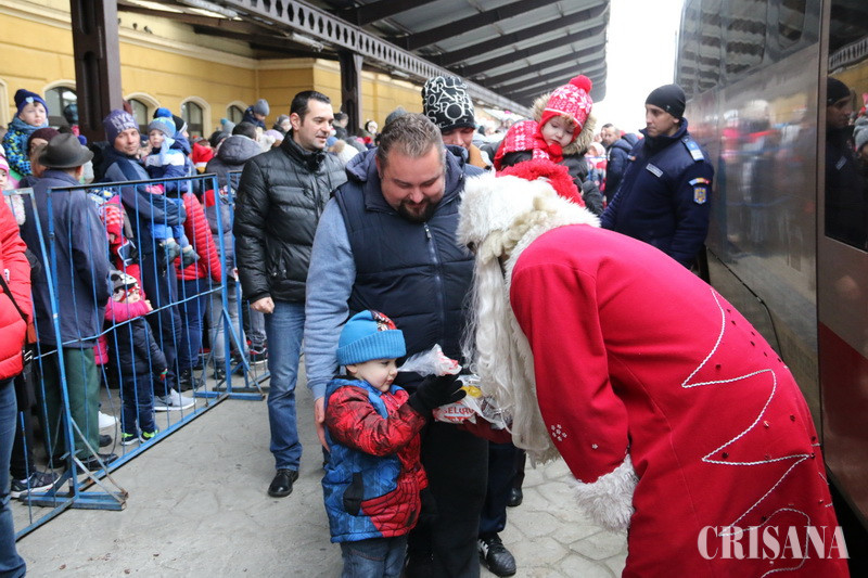 Zeci de mânuțe au încercat sâmbătă să treacă prin gardul pus de jandarmi la linia I în Gara Oradea pentru a-l atinge pe Moș Crăciun. Iar Moșul a fost darnic și la vorbe nu doar la cadouri. După ce a coborât din tren, a stat de vorbă cu micuții, i-a întrebat dacă au fost cuminți, dacă și-au ascultat părinții, i-a mângâiat și i-a lăsat să îi atingă hainele și barba. Jandarmii au organizat bine evenimentul, fiecare copil trecând cu părinții pe la Moș Crăciun pentru a primi pachețelul adus special din Laponia. După ce s-a asigurat că niciun copilaș nu a rămas fără cadou, Moș Crăciun a urcat în caleaşcă şi a pornit spre centru, pe traseul strada Republicii – Bdul Magheru – Centrul Civic – Piaţa Unirii. O dată ajuns la Târgul de Crăciun, Moşul a poposit lângă brad oferind o nouă serie de cadouri copiilor care l-au așteptat. În total, Moșul a împărțit 2.000 de pachete cu dulciuri.