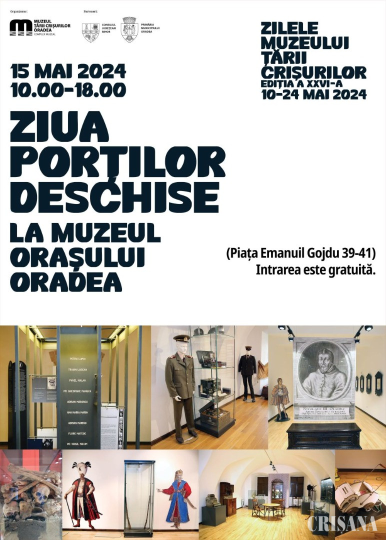 Publicul este invitat miercuri, 15 mai, la Ziua porților deschise la Muzeul Orașului Oradea (Cetate), prilej cu care se vor putea vizita, în mod gratuit, atât expozițiile permanente, recent modernizate conform standardelor actuale în domeniul muzeotehnicii, cât și cele temporare.