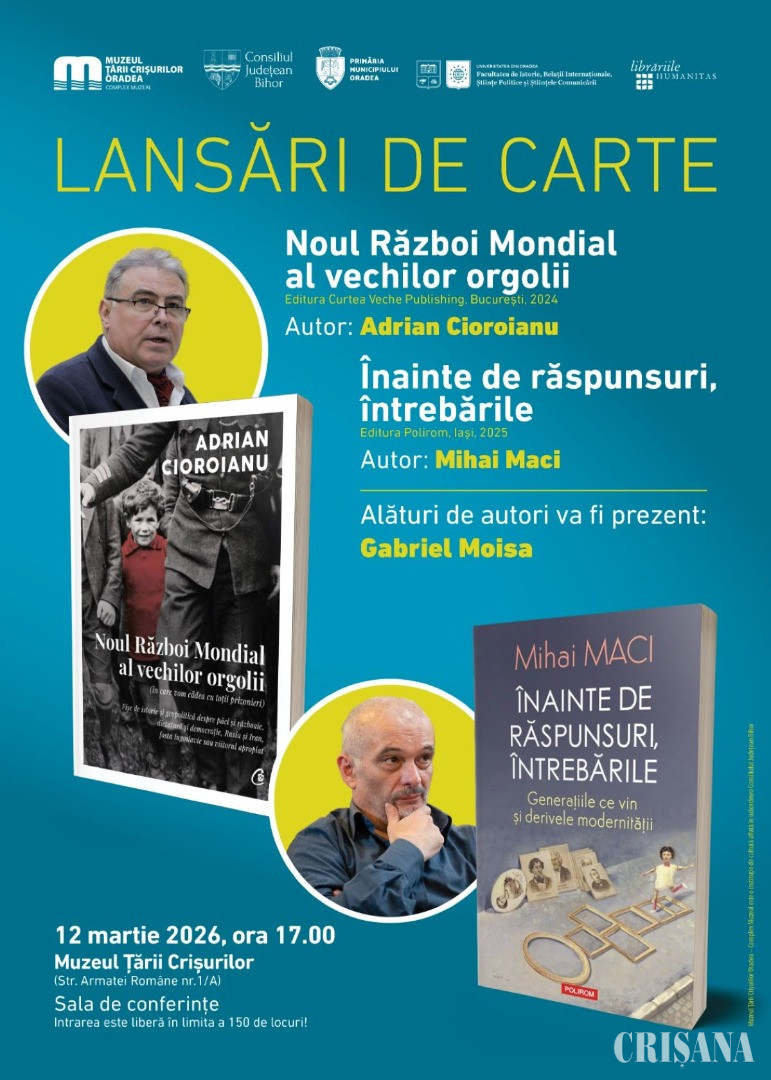 Muzeul Țării Crișurilor Oradea - Complex Muzeal organizează o dublă lansare de carte: Noul Război Mondial al vechilor orgolii, autor Adrian Cioroianu, și Înainte de răspunsuri, întrebările, autor Mihai Maci. Evenimentul va avea loc joi, 12 martie, de la ora 17.00, în Sala de conferințe a Muzeului Țării Crișurilor.