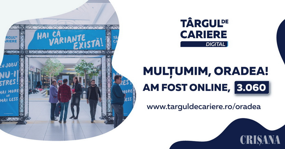 2.860 de persoane au participat miercuri, 27 mai, la Târgul de Cariere Digital Oradea, eveniment de recrutare și employer branding desfășurat exclusiv online. Acesta a fost organizat ca o premieră și soluție alternativă la evenimentele organizate offline, până în prezent, de către Târgul de Cariere.