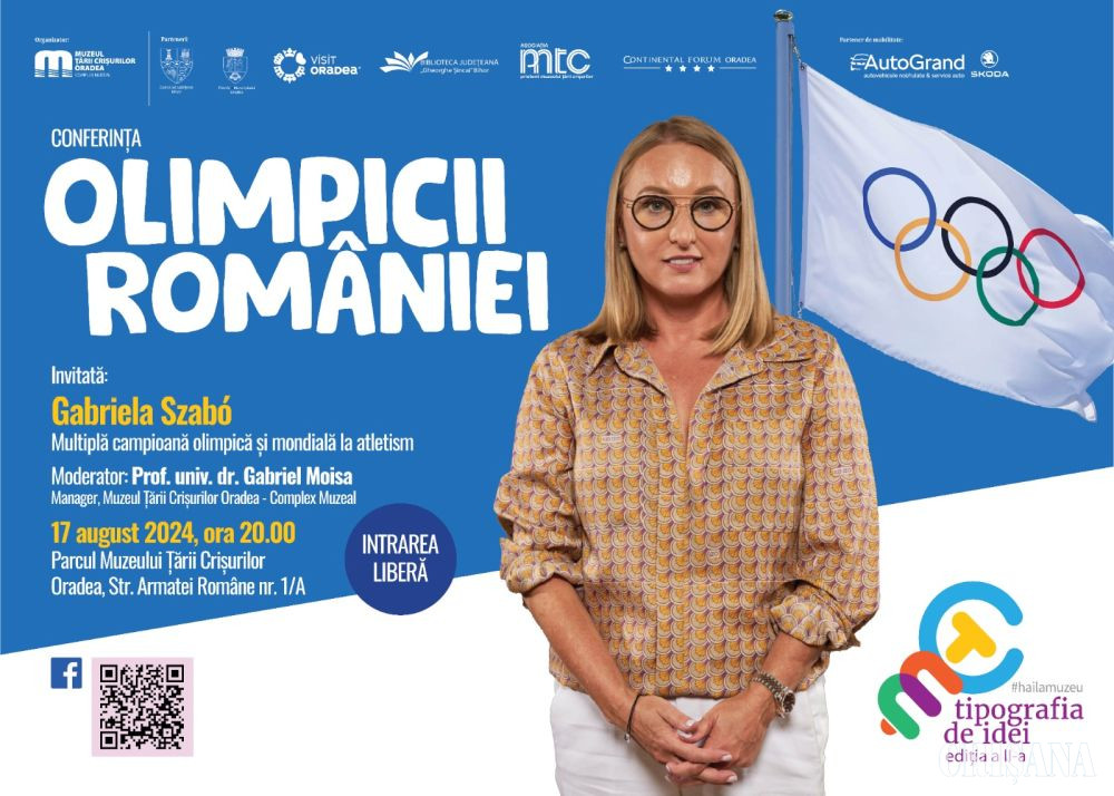 Muzeul Țării Crișurilor Oradea - Complex Muzeal, împreună cu Biblioteca Județeană „Gheorghe Șincai” Bihor și în parteneriat cu Consiliul Județean Bihor, Primăria Municipiului Oradea, Visit Oradea, Hotel Continental, Asociația „Prietenii Muzeului Țării Crișurilor” și Autogrand Oradea - Skoda, organizează, în cadrul evenimentului Conferințele Tipografiei de idei | #hailamuzeu, conferința Olimpicii României, susținută de prof. univ. dr. Gabriel Moisa, istoric și manager al instituției muzeale, alături de Gabriela Szabó, multiplă campioană mondială și olimpică. Evenimentul va avea loc sâmbătă, 17 august, de la ora 20.00, în parcul Muzeului Țării Crișurilor (str. Armatei Române nr.1/A). Această conferință va fi o sinteză a participării României la Jocurile Olimpice din 2024, oferind o perspectivă unică asupra succeselor și provocărilor întâmpinate de sportivii români. Prof. univ. dr. Gabriel Moisa și Gabriela Szabó vor discuta despre impactul și importanța acestor realizări în contextul sportului românesc.