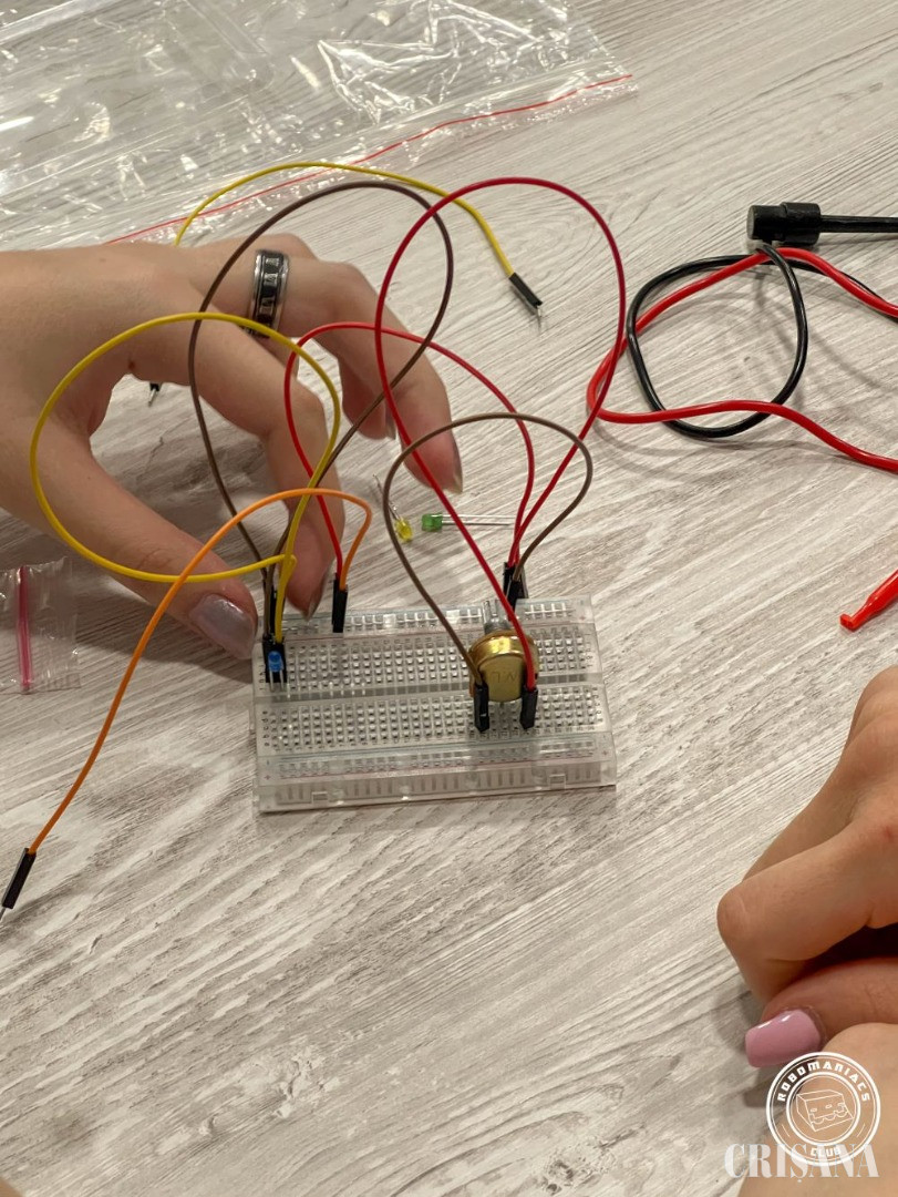 Lucian Știube a coordonat prima activitate din cadrul atelierului, oferind participanților o introducere în noțiunile fundamentale ale electronicii – de la curent și tensiune electrică până la elementele de bază ale circuitelor electronice. După ce au învățat teoretic cum să folosească un letcon, participanții au trecut la acțiune, realizând primele lor lipituri în echipe de câte 2-3 persoane. Fiecare lipitură a fost un pas semnificativ către construirea unui mic proiect funcțional realizat chiar de aceștia, iar acest proces a fost doar începutul unei serii de activități tehnice mai complexe.