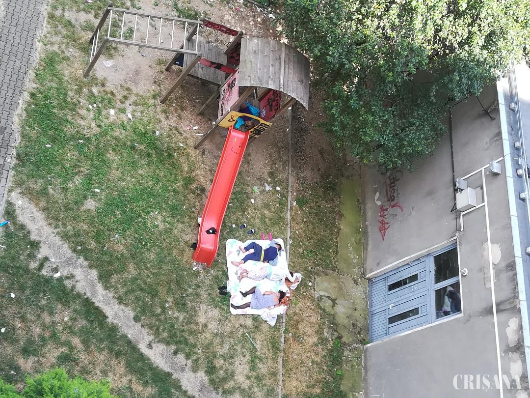 Zilele trecute, câțiva locatari din blocul de tip rezidențial de pe strada Lăpușului 17 din Oradea ne-au sesizat faptul că, în micul parc, situat chiar lângă imobilul în care locuiesc, s-a stabilit o familie de romi, copii și adulți, care fac o mizerie de nedescris. Noaptea, aceștia făceau un tărăboi până spre dimineață, încât cei care au apartamentele înspre parc nu puteau închide un ochi toată noaptea. Ziua, aceștia cerșeau pe unde apucau, iar seara, se strângeau, la culcare, în parcul pentru copii de lângă bloc.