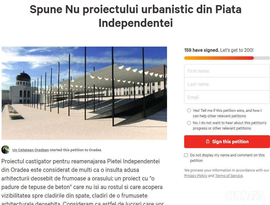 „Proiectul câştigător pentru reamenajarea Pieţei Independenţei din Oradea este considerat de mulţi ca o insultă adusă arhitecturii deosebit de frumoase a oraşului; un proiect cu „o pădure de ţepuşe de beton” care nu îşi au rostul şi care acoperă vizibilitatea spre clădirile din spate, clădiri de o frumuseţe arhitecturală deosebită. Considerăm că astfel de lucrări care vor afecta arhitectura oraşului pe multe decenii de acum înainte ar trebui supuse votului cetăţenilor oraşului. Ne-am săturat ca astfel de schimbări majore să se facă fără ca orădenii să fie măcar întrebaţi. „Nimic pentru noi fără noi!” Considerăm că orădenii trebuia să fie consultaţi şi să poată vota proiectul câştigător, un proiect mai în ton cu arhitectura şi istoria oraşului nostru”, se menţionează în petiţia lansată de „un cetăţean orădean” pe site-ul change.org şi intitulată „Spune Nu proiectului urbanistic din Piaţa Independenţei”.