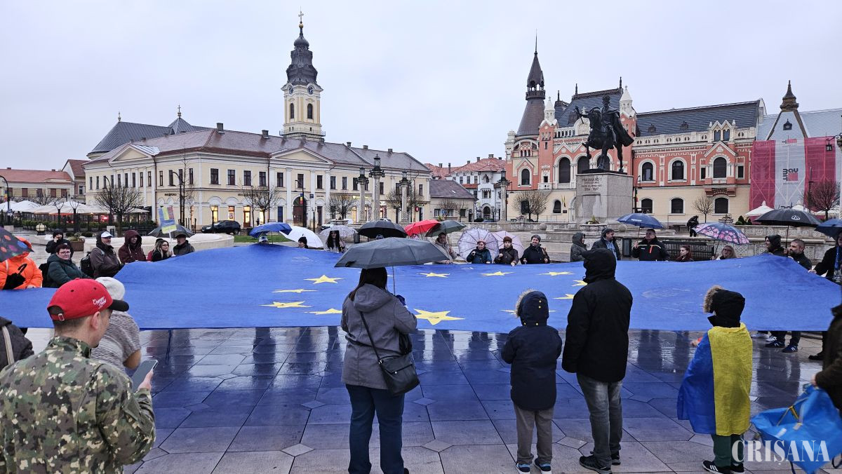 În jur de 100 de persoane au participat sâmbătă, 15 martie, în Piața Unirii, la un miting pro-democrație și pro-UE în ciuda ploii care, pe alocuri, a turnat cu găleata. Ascunși sub umbrele, participanții au desfășurat un steag al UE de mari dimensiuni, au glumit și au ascultat muzică.