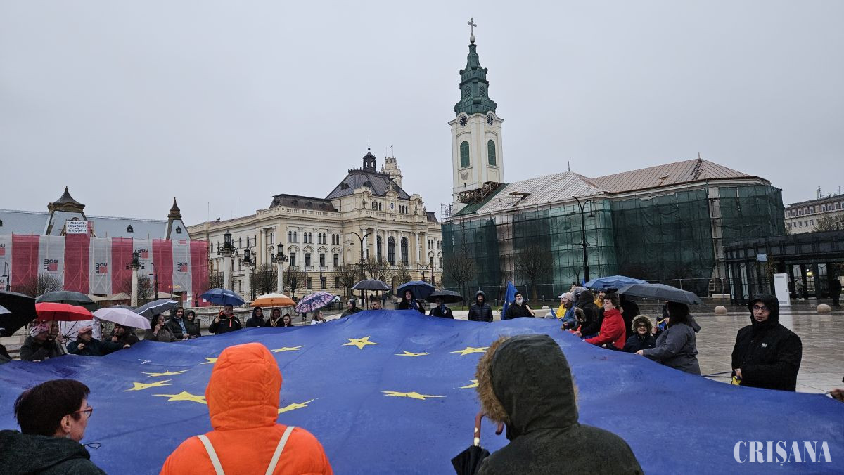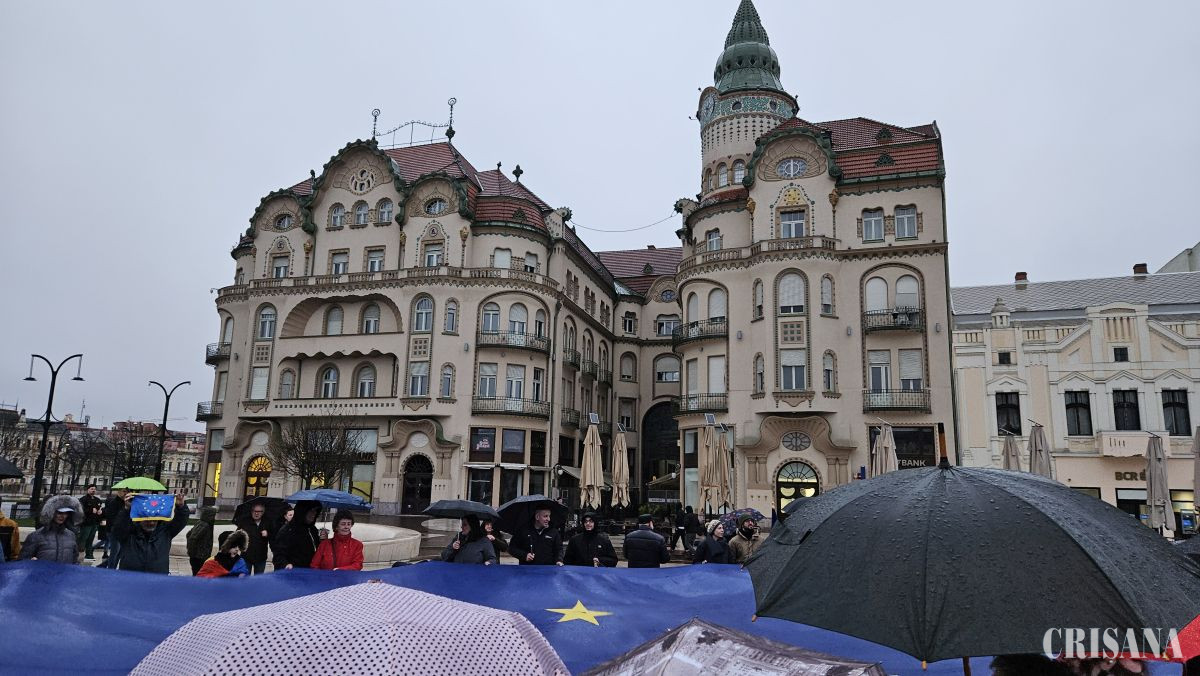 Fără urlete, cămăși rupte, agresivitate și amenințări, așa a arătat mitingul pro-democrație din centrul Oradiei. Participanții au venit „înarmați” cu steaguri ale României și ale Europei, cu umbrele de diferite culori și cu zâmbetul pe buze. Dintr-o boxă, ascunsă și ea de ploaie, s-a auzit „Vreau o țară ca afară” a trupei Vunk, „Imnul Europei” și „Insieme” a lui Toto Cutugno. Un copil, înfășurat în tricolor, a ales să se joace în ploaie iar un jandarm i-a atras atenția unei femei că își pierduse o mănușă în drum spre miting. Ascunși sub umbrele, participanții au desfășurat apoi un steag al Uniunii Europene de mari dimensiuni, potrivit într-o Piață a Unirii refăcută pe bani europeni.