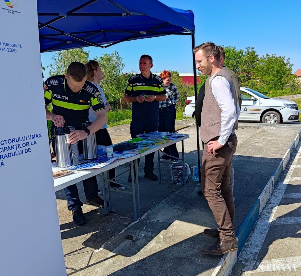 Polițiștii rutieri bihoreni au oprit în trafic, luni, autoturismele care au intrat în țară dinspre PTF Borș, pe Șoseaua Borșului, înainte de intrarea în municipiul Oradea și i-au servit pe conducătorii auto și pe pasagerii acestora cu cafea și apă, oferindu-le astfel prilejul de a se revigora, înainte de a-și continua călătoria.