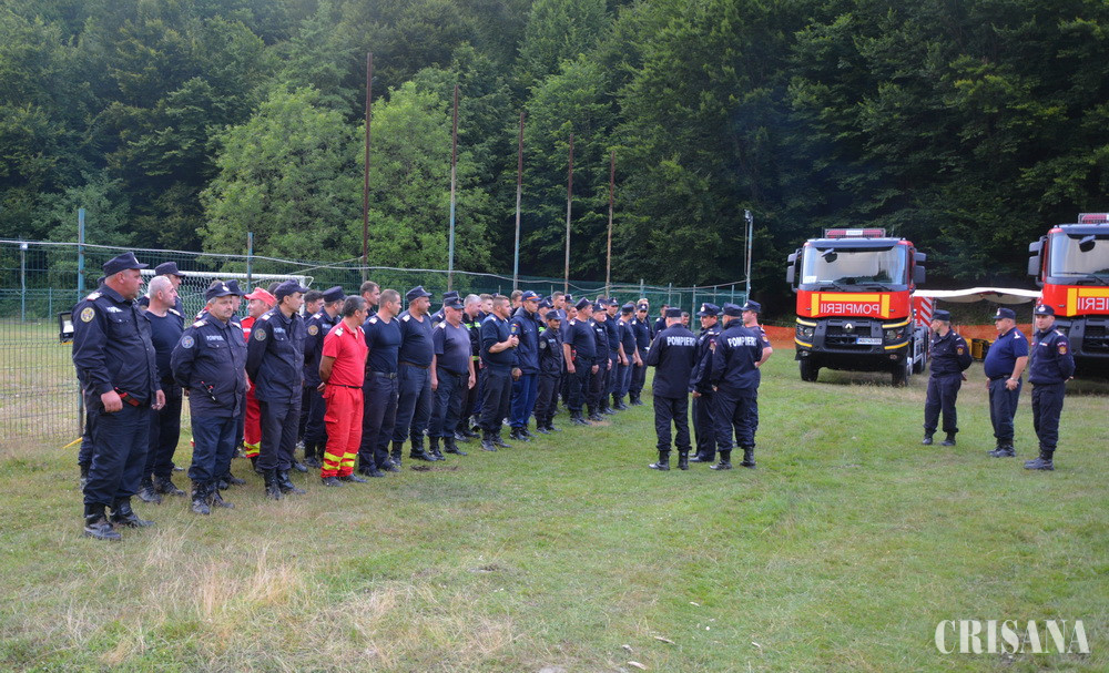 În acest amplu exerciţiu, coordonat și condus în teren de inspectorul șef al ISU Crișana, colonel Caba Sorin Mihai, au fost angrenați peste 60 de pompieri militari din judeţele amintite, care au intervenit cu 4 autospeciale de lucru cu apă și spumă, autocamioane de intervenție, autospeciale de primă intervenție și comandă, 4 motopompe și mijloace specifice de intervenție la incendii de pădure, precum și 9 pompieri voluntari cu 5 autospeciale de intervenție, din cadrul Serviciilor Voluntare pentru Situații de Urgență Criștioru de Jos și Lunca. La activitate au participat, de asemenea, reprezentanți ai Inspectoratului de Poliţie Judeţean Bihor, Jandarmeriei Bihor, Gărzii Naţionale de Mediu şi Agenţiei pentru Protecţia Mediului, ai Direcţiei Silvice Bihor, Gărzii Forestiere Bihor, respectiv Asociațiile West Alpine Off Road Bihor și Descoperă România 4X4.