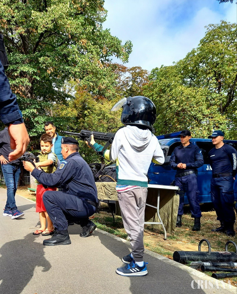Jandarmii bihoreni și-au prezentat și ei autospecialele, armamentul și tehnica din dotare, impresionându-i pe micuți. Cel mai solicitat pentru fotografii a fost câinele lup Odin, antrenat pentru misiuni speciale. Copiii au învățat să se apere folosind mănuși și căști în cadrul unui atelier de box.