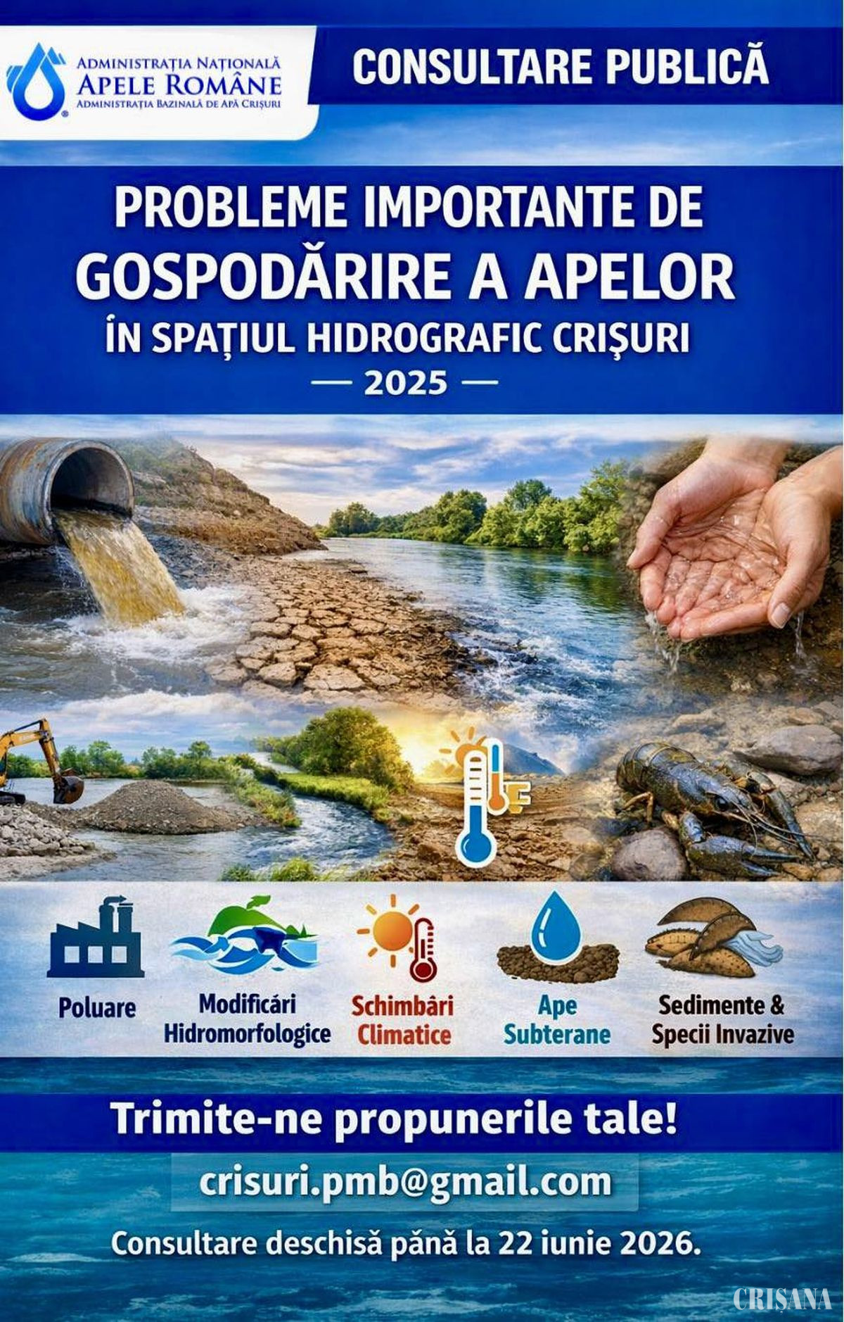 Administrația Bazinală de Apă Crișuri a publicat, în 22 decembrie, documentul „Probleme importante de gospodărire a apelor în spațiul hidrografic Crișuri – 2025”, etapă esențială în elaborarea viitorului Plan de Management al bazinului hidrografic. Documentul analizează principalele provocări legate de: poluare, modificări hidromorfologice, efectele schimbărilor climatice, starea apelor subterane, gestionarea sedimentelor și a speciilor invazive. Publicul este invitat să studieze materialul și să transmită observații sau propuneri. Documentul poate fi consultat pe: https://crisuri.rowater.ro/