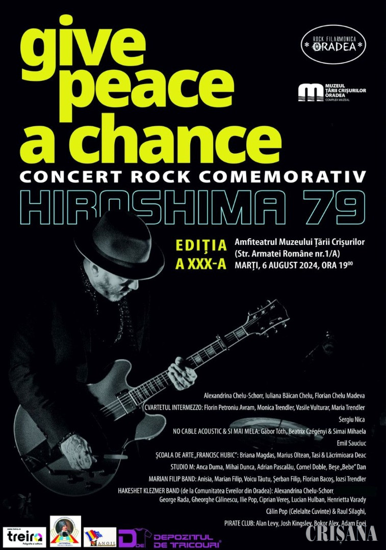 „Pentru prima dată în viață, suntem în situația de a solicita ajutor. Organizăm (marți, 6 august, de la ora 19.00 - n.r.), pentru a 30-a oară, concertul rock-comemorativ „Give peace a chance”, la 79 de ani de la atentatul cu bomba atomică asupra Hiroshimei. Mesajul e de PACE, dar și o revoltă prezentă față de pericolul nuclear care plutește acum în aer”, anunță Alexandrina Chelu.