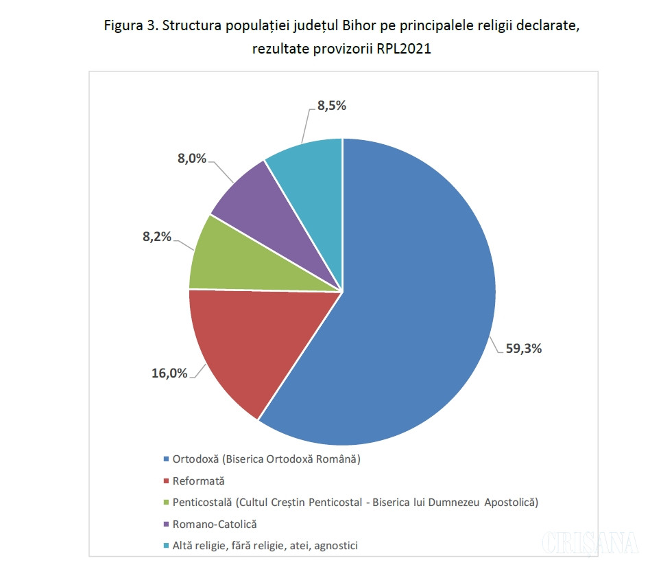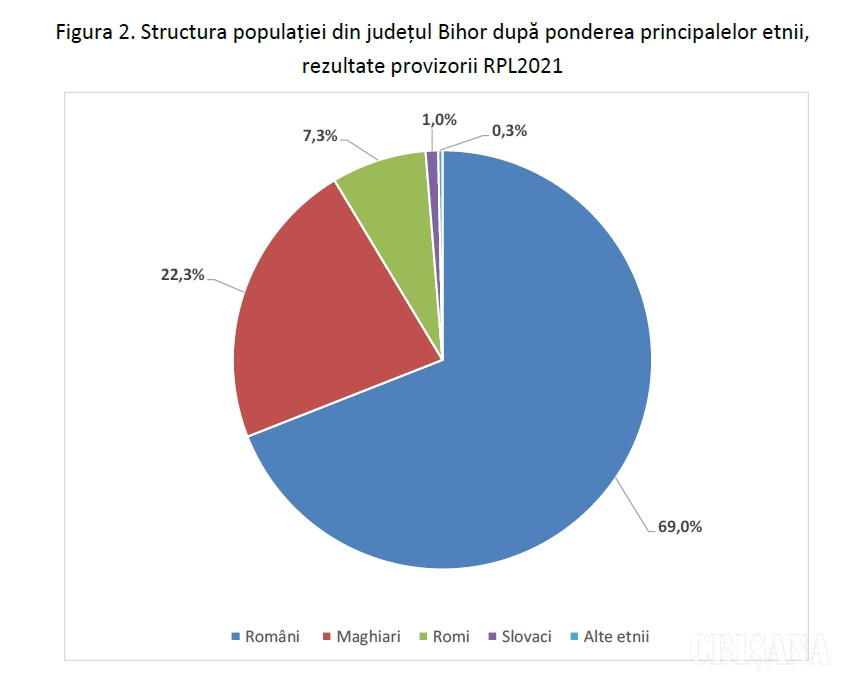 „La RPL2021, înregistrarea etniei, limbii materne și a religiei s-a făcut pe baza liberei declarații a persoanelor recenzate. Pentru persoanele care au refuzat să declare aceste trei caracteristici, precum și pentru persoanele pentru care informațiile au fost colectate indirect din surse administrative, informația nu este disponibilă. Ca urmare, structurile prezentate în continuare pentru cele 3 caracteristici etno-culturale sunt calculate în funcție de numărul total de persoane care și-au declarat etnia, limba maternă și respectiv religia și nu în funcție de numărul total al populației rezidente”, precizează DJS Bihor.