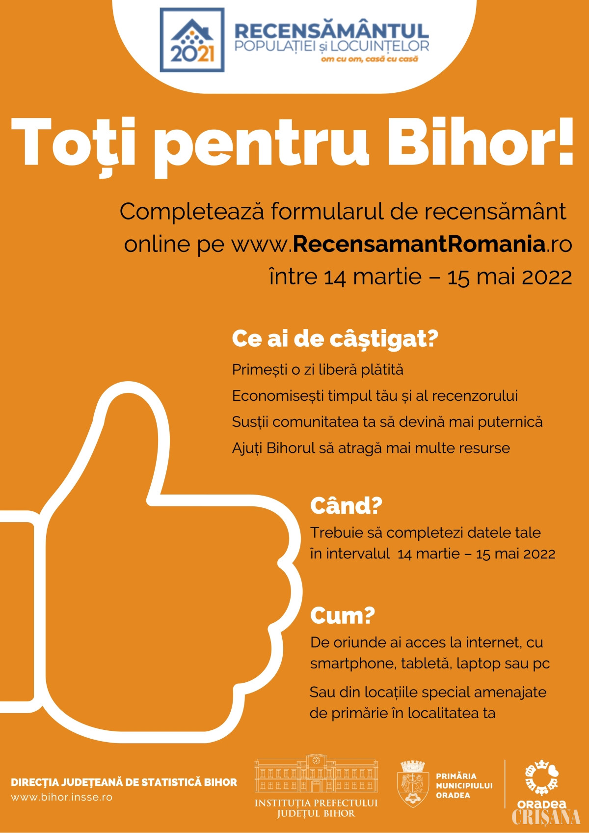 Recensământul din acest an vine cu o noutate: fiecare persoană se poate autorecenza, completând online un formular personal cu datele solicitate. În perioada 14 martie - 15 mai, cetăţenii au posibilitatea să se înregistrezi accesând link-ul https://autorecenzare.insse.ro, completat deja parțial cu anumite date obţinute prin colectarea indirectă, pe baza unui nume de utilizator şi a unei parole.